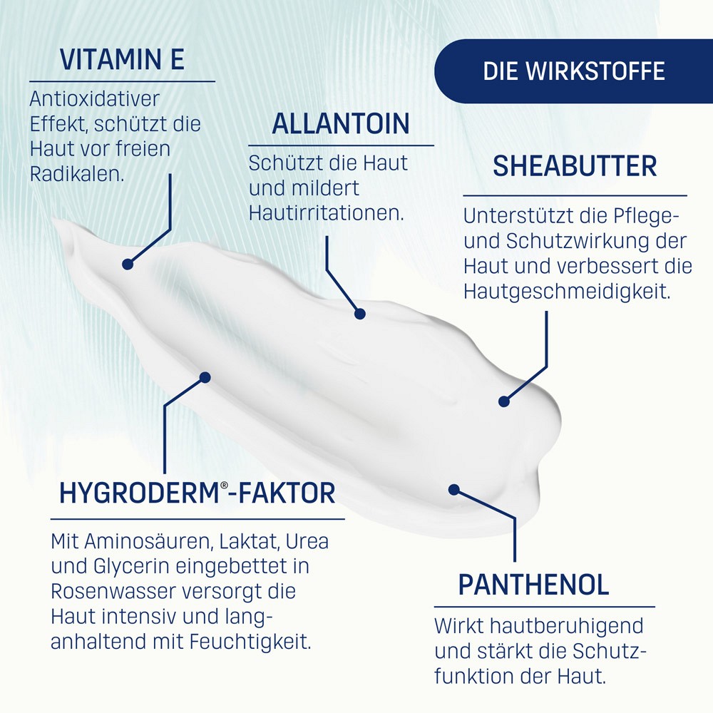 - Mit Hygroderm®-Faktor. Versorgt die Haut intensiv und langanhaltend mit Feuchtigkeit