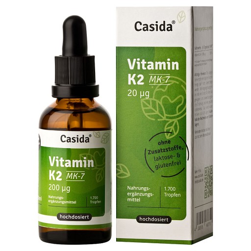 Hochdosierte Vitamin K2 Tropfen mit 200 µg pflanzlichem Menaquinon (MK-7) Tagesdosis. 50 ml ergeben ca. 1700 Tropfen.