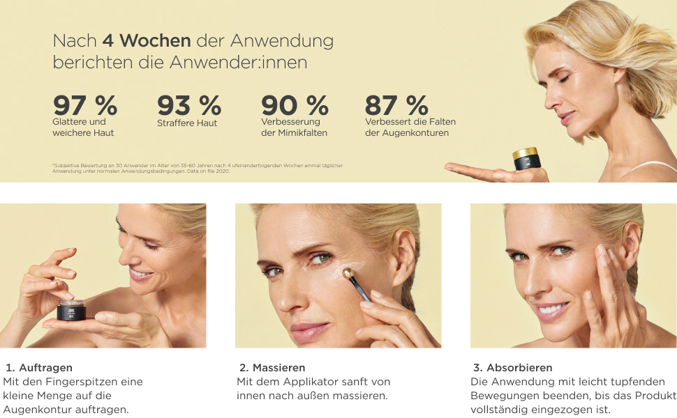 *Subjektive Bewertung von 30 Anwendern*innen im Alter von 35-60 Jahren nach Anwendung über 4 aufeinanderfolgende Wochen, einmal täglich unter normalen Anwendungsbedingungen. Data on file, 2020.