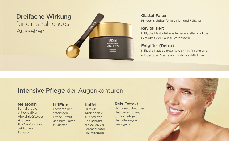 Vital Eyes ist eine reparierende Augencreme mit Melatonin und Koffein, die hilft, Mimikfalten und Fältchen zu glätten. Seine Inhaltsstoffe stimulieren die antioxidativen Abwehrkräfte der Haut und sorgen für eine entgiftende Wirkung. Der beiliegende Applikator sorgt zudem für einen kühlenden Effekt. Sichtbare Ergebnisse in nur 28 Tagen.