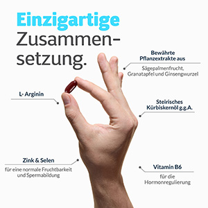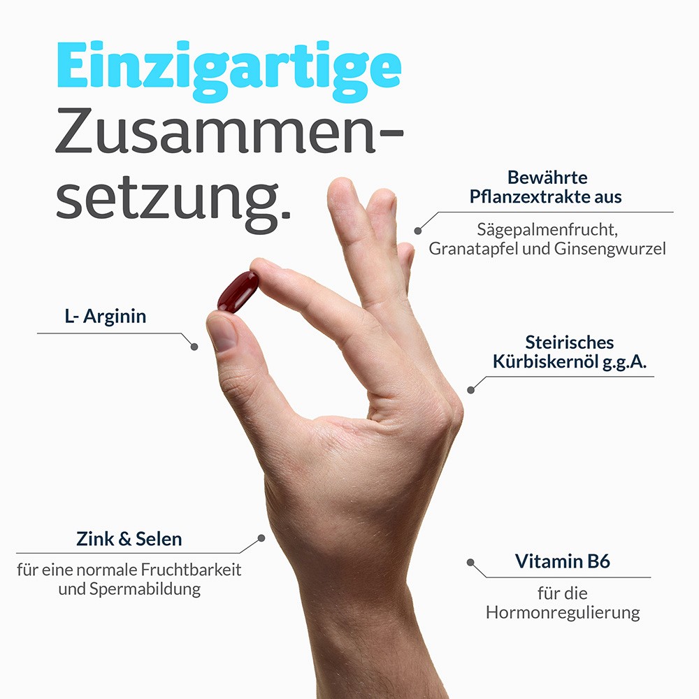 - Enthält Sägepalmenfrucht, Ginsengwurzel & Granatapfelextrakt, Steirisches Kürbiskernöl g.g.A., L-Arginin, Zink, Selen und Vitamin B6