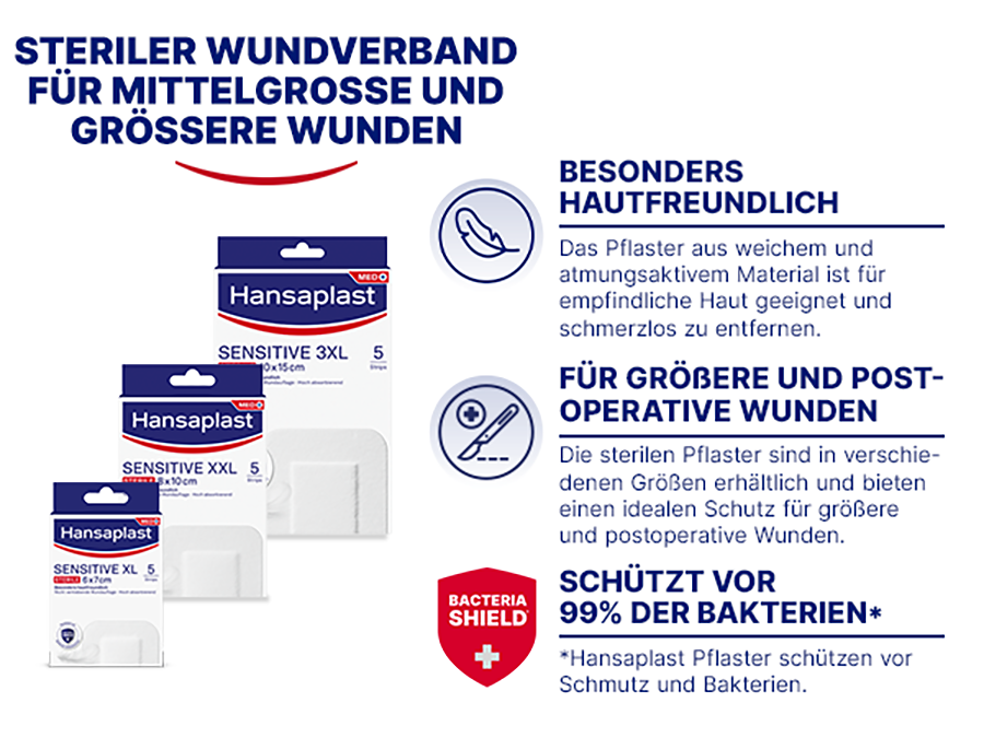 Der Hansaplast Sensitive XL Wundverband dient zur Versorgung von größeren Schürf- und Schnittwunden sowie kleinerer postoperativer Wunden. Das Pflaster ist besonders saugfähig und nimmt Wundexsudat sicher auf. Das atmungsaktive und hautfreundliche Material verhindert ein Verkleben mit der Verletzung.Zudem hilft das große Pflaster beim Schutz gegenüber Umwelteinflüssen wie Schmutz. Das Wundpflaster ist schonend für die Haut und lässt sich problemlos entfernen. Der Verband ist latexfrei*.