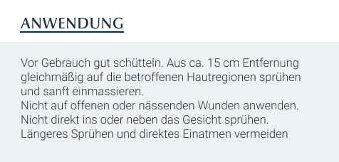Die Wirksamkeit und Hautverträglichkeit im Zusammenhang mit dermatologischen Behandlungen in wissenschaftlichen Studien sind nachgewiesen. Die Salbe ist ideal als Hautpflege bei Xerosis und bei strapazierter, trockener Haut. Das Spray enthält keine Duft- und Konservierungsstoffe und ist nicht komedogen.