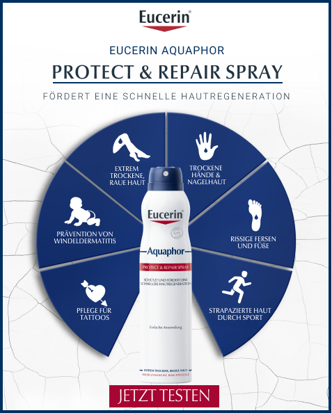 Das Eucerin Aquaphor Protect & Repair Spray enthält die bewährte Aquaphor Formulierung zum Sprühen, um auch der Haut an Rücken und Beinen eine intensive Pflege zu bieten und die Hautregeneration zu fördern.