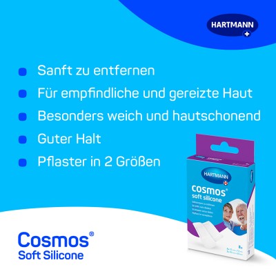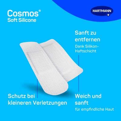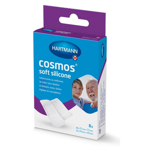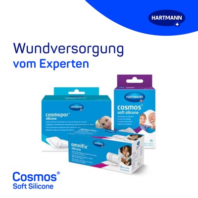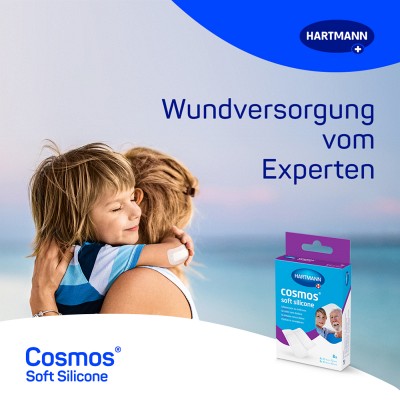 Cosmos soft silicone Pflaster eigenen sich zur besonders sanften Wundversorgung selbst bei empfindlicher oder gereizter Haut. Dank des verwendeten Silikonklebers haftet cosmos soft silicone gut und kann dennoch sanft von der Haut gelöst werden.