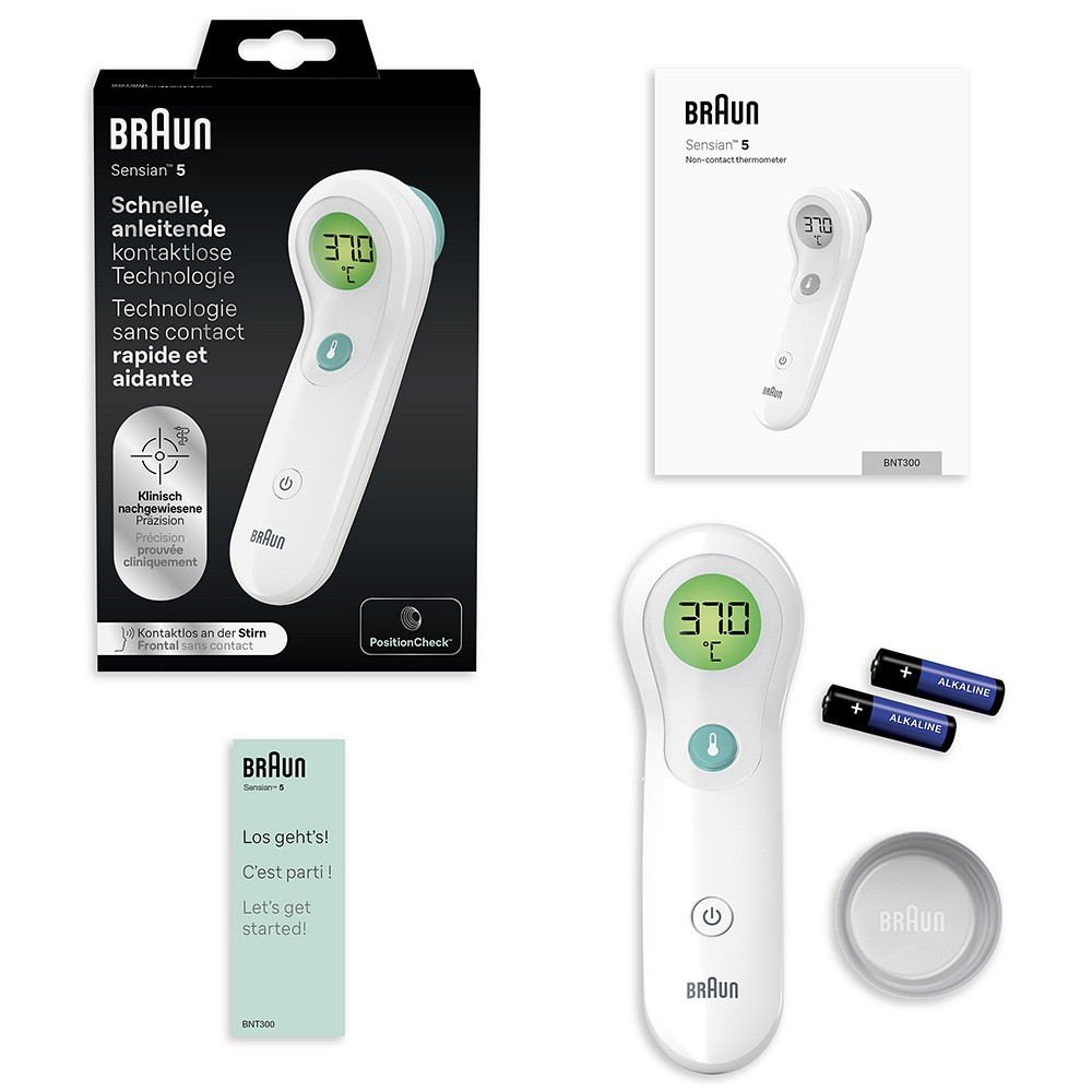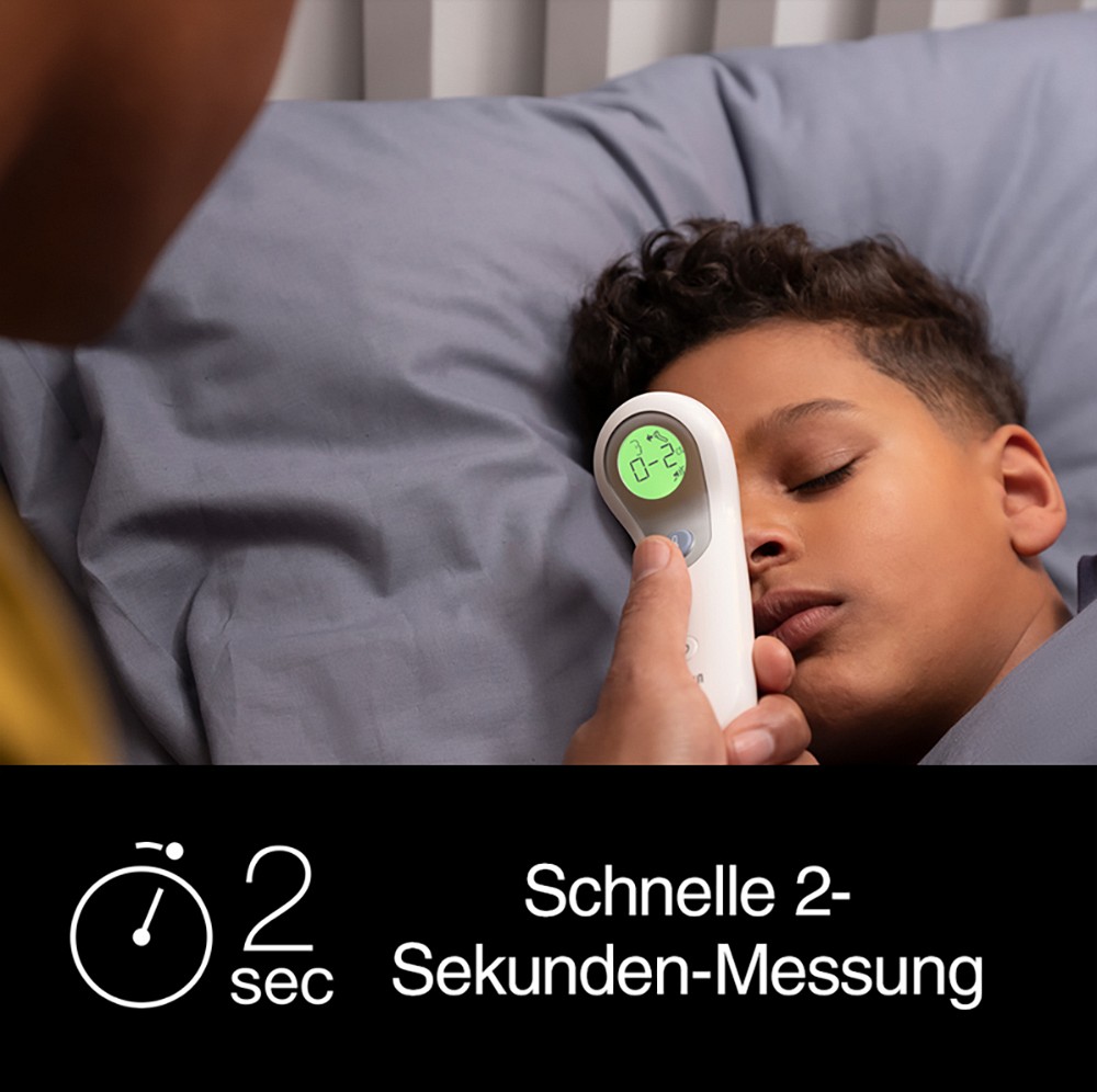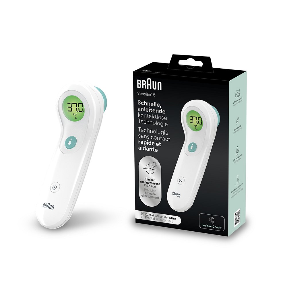 Fieberthermometer mit Kontakt- und berührungslosem ModusBraun Sensian 5 Berührungsloses Stirnthermometer BNT300 – Einfachheit und Bequemlichkeit von der Nr. 1 bei Ärzten*¹. Dieses Thermometer mit Kontakt- und berührungslosem Modus sowie PositionCheck-Technologie verfügt über ein Pilotlicht, einen Näherungssensor und eine Bildschirmführung, sodass Sie sich auf präzise Messungen* und Ergebnisse verlassen können. Außerdem erleichtert die farbcodierte Fieberkurve die Interpretation der Ergebnisse*²⁺³.