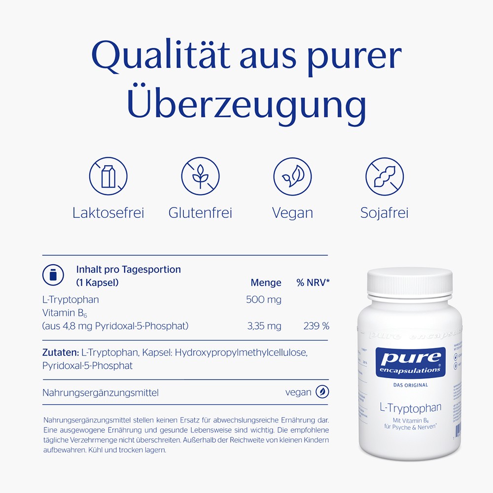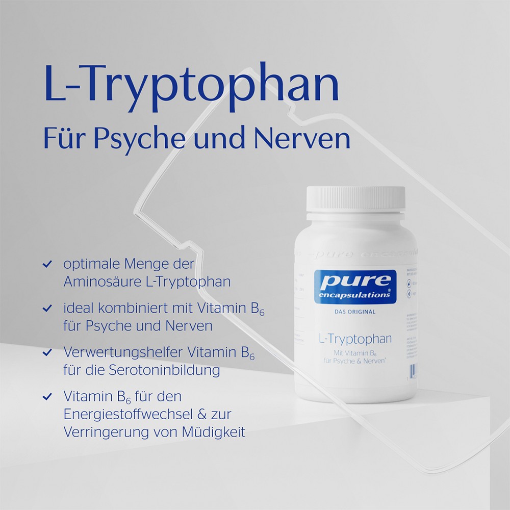 Die Forschung hat gezeigt, dass ein ausgeglichener Neurotransmitter-Haushalt die Stimmung positiv beeinflusst. Das Produkt L-Tryptophan mit Vitamin B6 von Pure Encapsulations® liefert wichtige Bausteine für die Serotoninbildung.L-Tryptophan ist eine essenzielle Aminosäure, was bedeutet, dass sie vom Körper nicht selbst produziert wird. Aus diesem Grund sind wir auf eine regelmäßige Zufuhr der Aminosäure über die Ernährung angewiesen – nur so wird eine ausreichende Verfügbarkeit für die Bildung des Botenstoffes Serotonin im Gehirn sichergestellt.