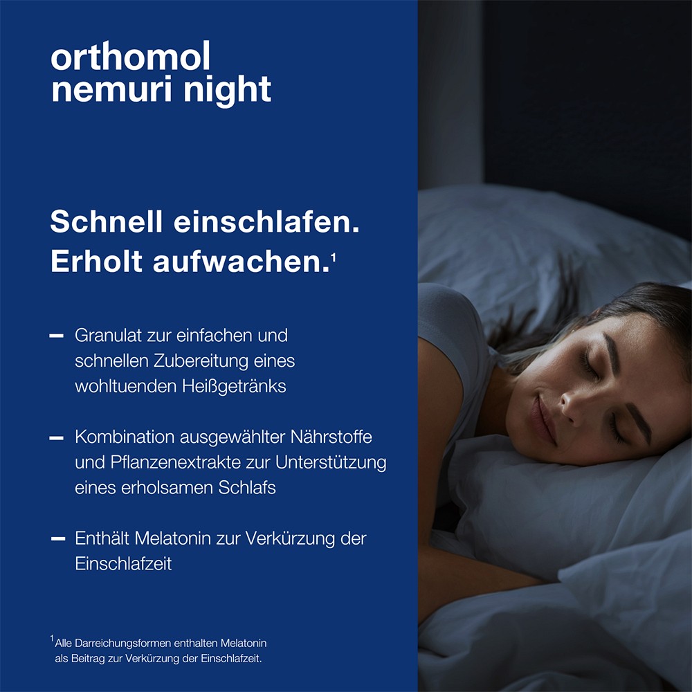 Orthomol Nemuri night ist ein Nahrungsergänzungsmittel. Mit Melissen-Extrakt, Hopfen-Extrakt, Glycin und L-Tryptophan.