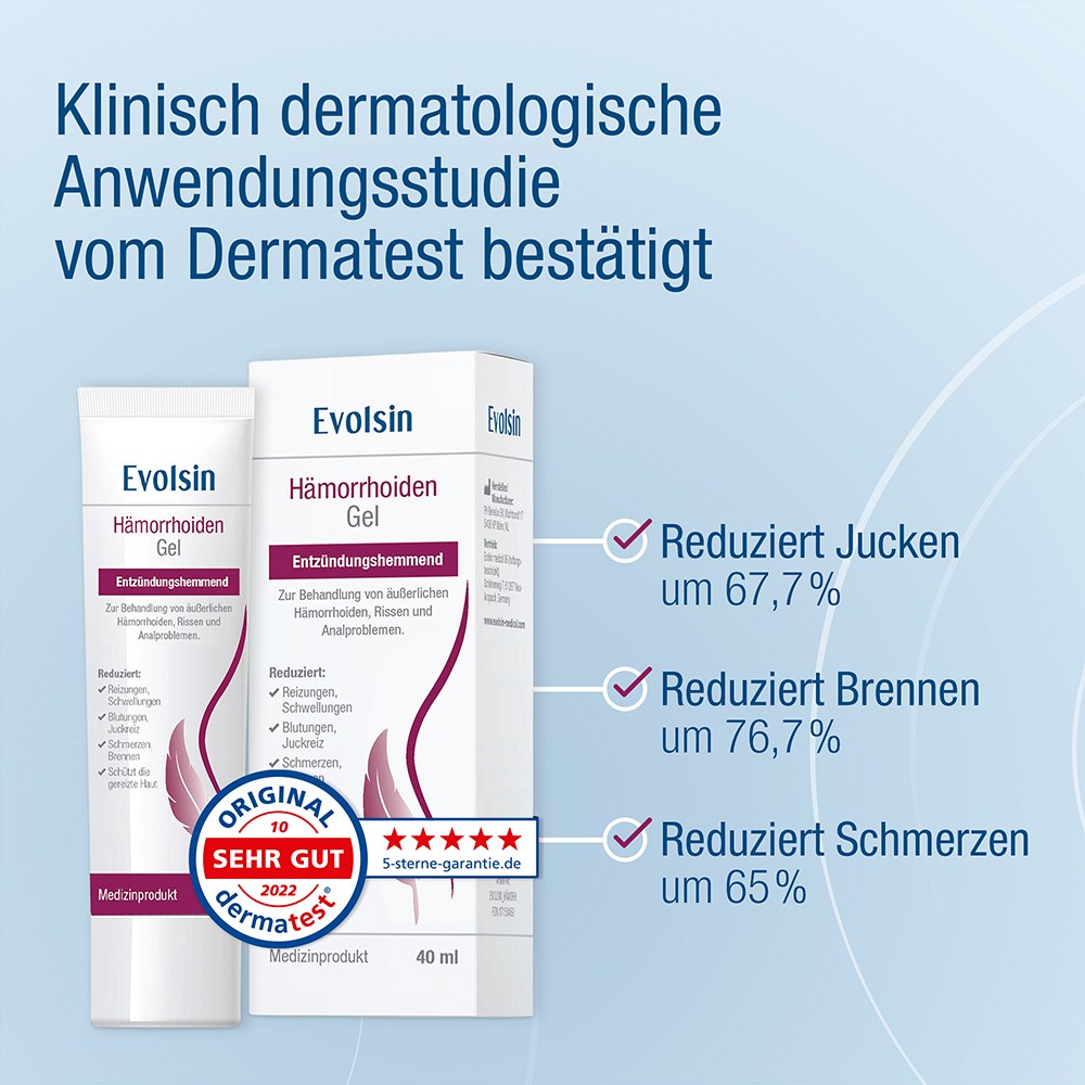 Evolsin Hämorrhoiden Gel ist ein Medizinprodukt zur Behandlung von äußerlichen Hämorrhoiden und anderen geringfügigen anorektalen Erkrankungen, wie beispielsweise Analjucken, Rissen oder Fissuren. Dieses Schutzgel reduziert Reizungen, Irritationen, Schwellungen, Jucken, Schmerzen und Brennen und verhindert den Kontakt der gereizten Haut mit Reizflüssigkeiten sowie Stuhl aus dem