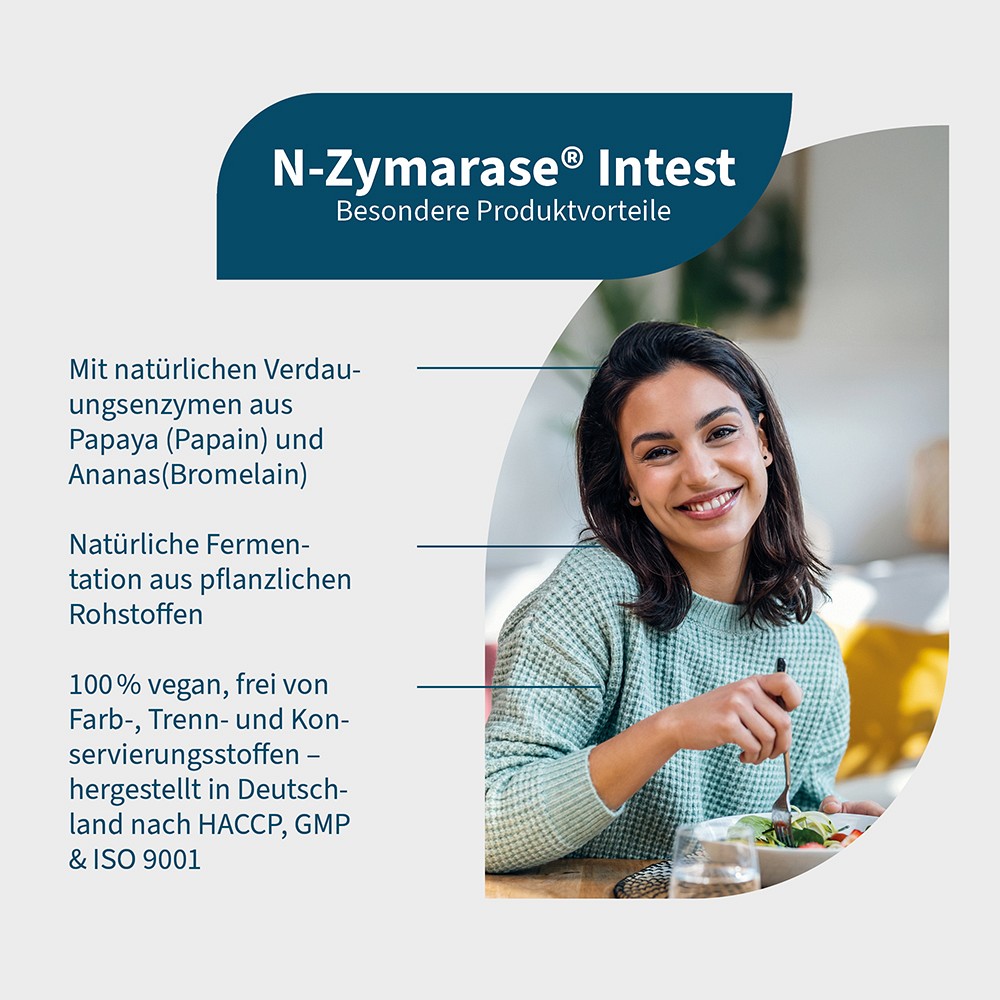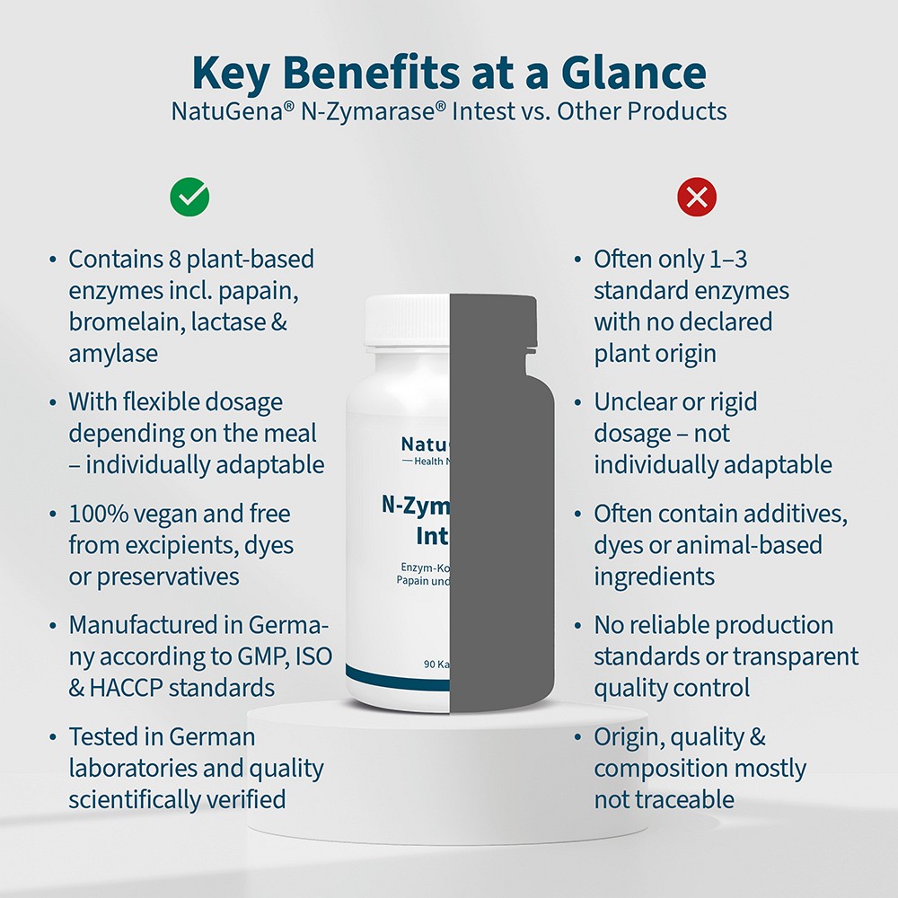 NatuGena N-Zymarase Intest enthält eine abgestimmte Kombination aus acht unterschiedlichen Enzymen, die auf die Aufspaltung typischer Nahrungsbestandteile ausgerichtet sind. Zwei dieser Enzyme, Papain aus der Papaya und Bromelain aus der Ananas, stammen aus pflanzlicher Quelle und sind speziell auf die Spaltung von Eiweißen ausgelegt. Sie unterstützen die Zerlegung von Proteinen in kleinere Bausteine und sind in unterschiedlichen pH-Bereichen aktiv, was ihre Aktivität entlang des gesamten Verdauungstrakts begünstigt.