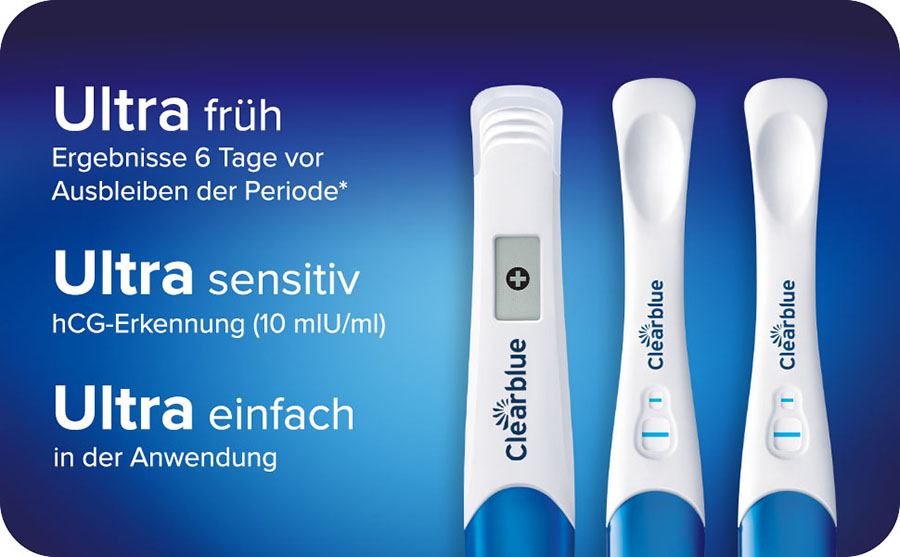 3 Schwangerschaftstests mit einer Testempfindlichkeit von 10 mIU/ml für zusätzliche Sicherheit in der Frühschwangerschaft!Mit dieser Packung können Sie bis zu 6 Tage vor dem Ausbleiben der Periode (5 Tage vor Fälligkeit der Periode) DREI Tests durchführen1: Sie enthält einen Clearblue Schwangerschaftstest Ultra Frühtest Digital und zwei Clearblue Schwangerschaftstests Ultra Frühtest. Mit keinem anderen Test können Sie früher testen!