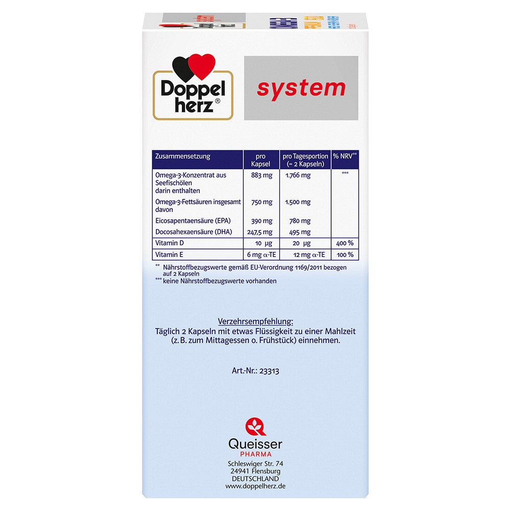 Doppelherz system OMEGA-3 PREMIUM 1500 Kapseln enthalten ein hochgereinigtes Konzentrat aus Seefischölen mit den wertvollen Omega-3-Fettsäuren EPA und DHA in Kombination mit Vitamin D3 und E. Durch die hohe Konzentration an Omega-3-Fettsäuren liefern bereits zwei Kapseln täglich 1.500 mg Omega-3-Fettsäuren, davon 780 mg EPA und 495 mg DHA.