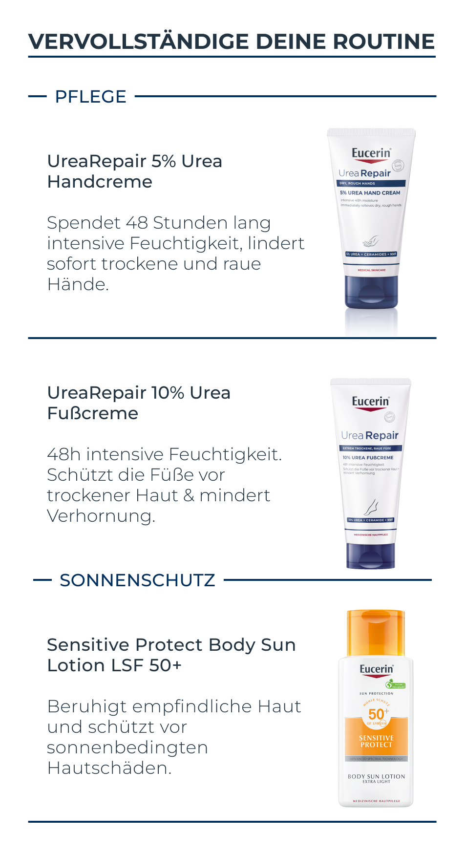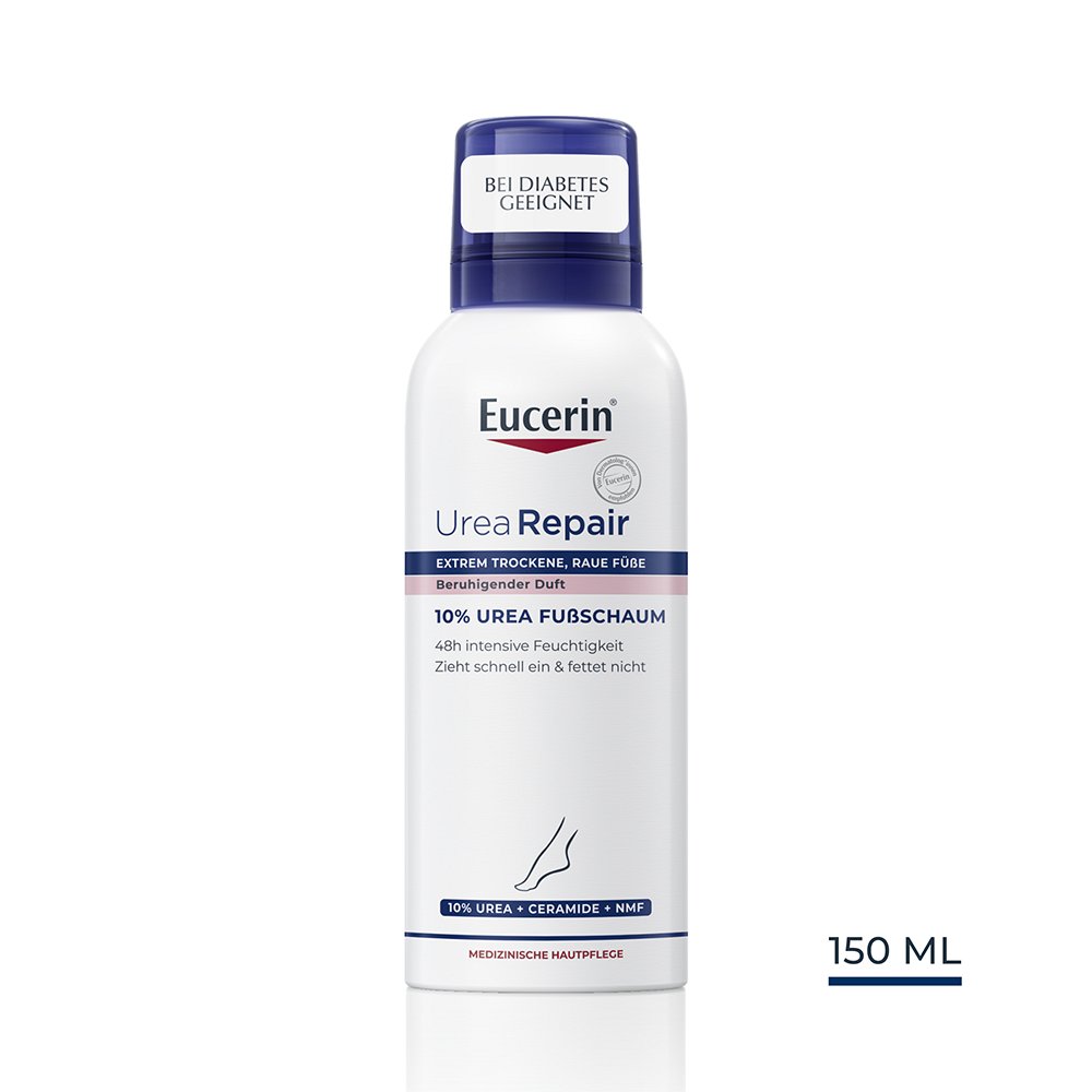 Gerade die Haut an den Füßen kann rasch trocken werden. Um rauen, trockenen Füßen ihre angenehme Geschmeidigkeit zurückzugeben, ist der Eucerin UreaRepair 10% Urea Fußschaum optimal geeignet.Verschiedene Pflegewirkstoffe sorgen für glatte und weiche Füße. 10% Urea zusammen mit natürlichen Feuchthaltefaktoren (NMF) spenden den Füßen bis zu 48 Stunden Feuchtigkeit und reduzieren Verdickungen der Haut und Hornhaut.