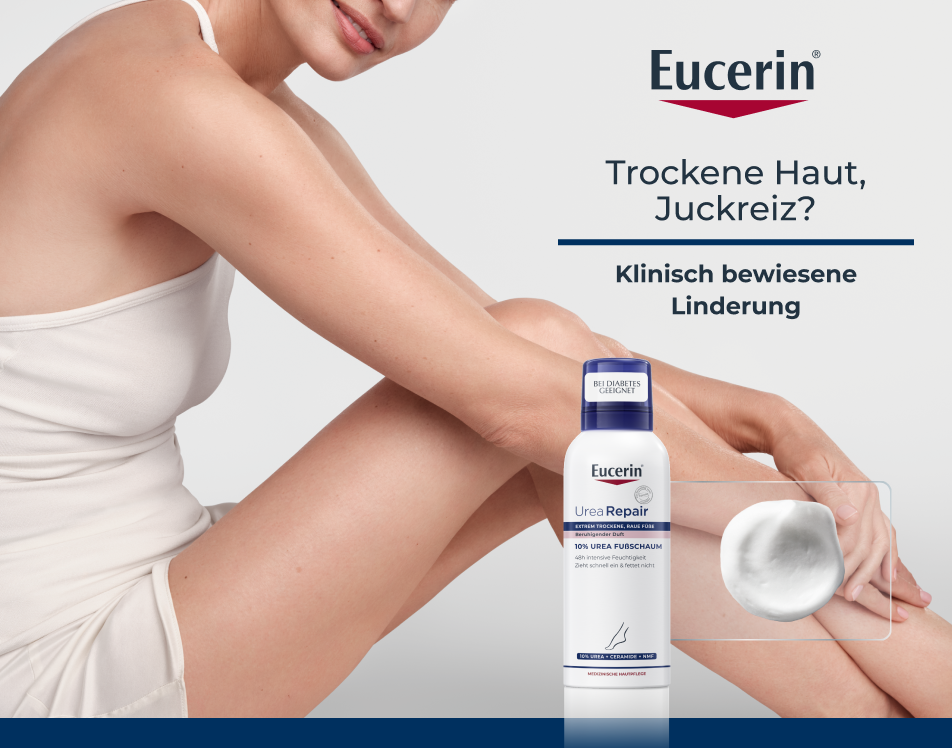 Dermatologische und klinische Studien belegen die sehr gute Wirksamkeit und Verträglichkeit des Urea Schaums, auch für die diabetische Haut. Im Test stellten 94% der Anwender fest, dass die neuartige Urea Fußpflege von Eucerin die Füße langanhaltend glättet. 96% bestätigten zudem, dass trockene Haut regeneriert wird.*