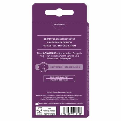 Ritex LONGTIME Kondome sind dermatologisch getestet und haben eine sehr gute Hautverträglichkeit. Das besondere Waschverfahren verleiht allen Ritex Kondomen einen angenehmen Geruch.