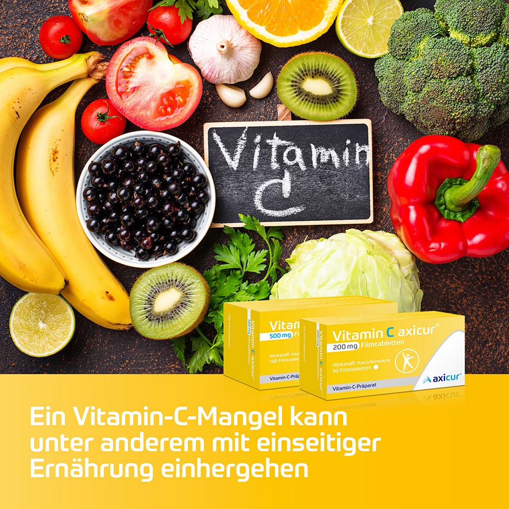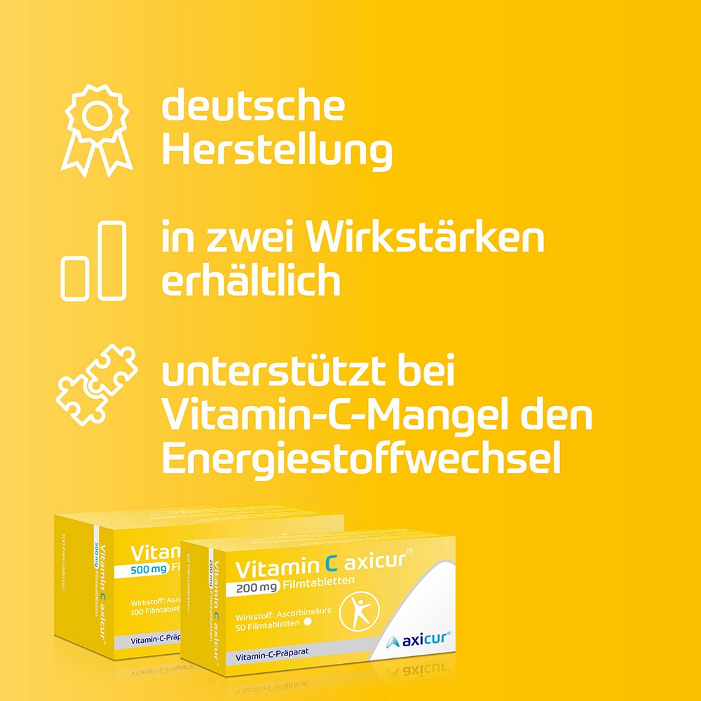 Der Wirkstoff Ascorbinsäure, auch Vitamin C genannt, dient zur Therapie von Vitamin-C- Mangelkrankheiten. Vitamin C axicur® ist in zwei Wirkstärken erhältlich: 200 mg und 500 mg.Ihre Vitamin C axicur® 200 mg Vorteile auf einem Blick: