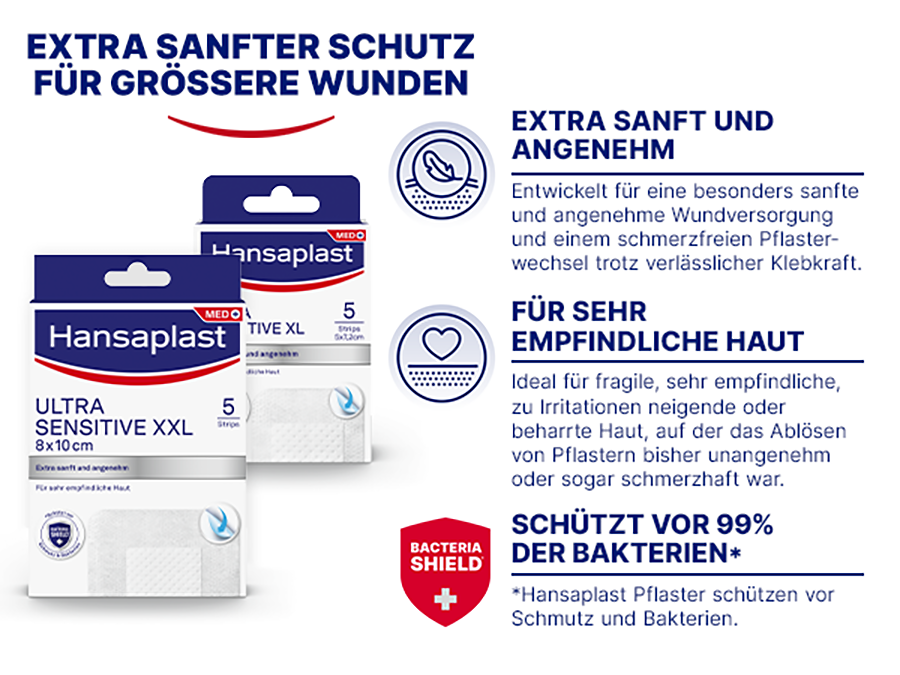 Das Hansaplast Ultra Sensitive XXL Pflaster verfügt über eine fortschrittliche Silikon-Technologie mit Gel ähnlicher Klebmasse und eignet sich damit als sanfte, angenehme Wundversorgung für sehr empfindliche Haut, denn es lässt sich schmerzlos entfernen. Das Entfernen von Pflastern mit traditionellem Klebstoff kann gerade bei empfindlicher Haut schmerzhaft sein, da oft Hautzellen oder Haare mit abgelöst werden.