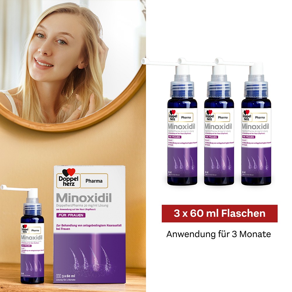 MINOXIDIL DoppelherzPharma enthält den Wirkstoff Minoxidil und ist ein Arzneimittel zur Behandlung des Haarausfalls von Frauen. MINOXIDIL DoppelherzPharma stabilisiert den Verlauf der androgenetischen Alopezie bei Frauen (charakteristische, ungleichmäßige anlagebedingte Kopfhaarausdünnung im vorderen oberen Bereich der Kopfhaut) und kann so dem Fortschreiten dieser Alopezie entgegenwirken.Die Behandlung mit MINOXIDIL DoppelherzPharma fördert das Haarwachstum und wirkt dem Fortschreiten der androgenetischen Alopezie entgegen.