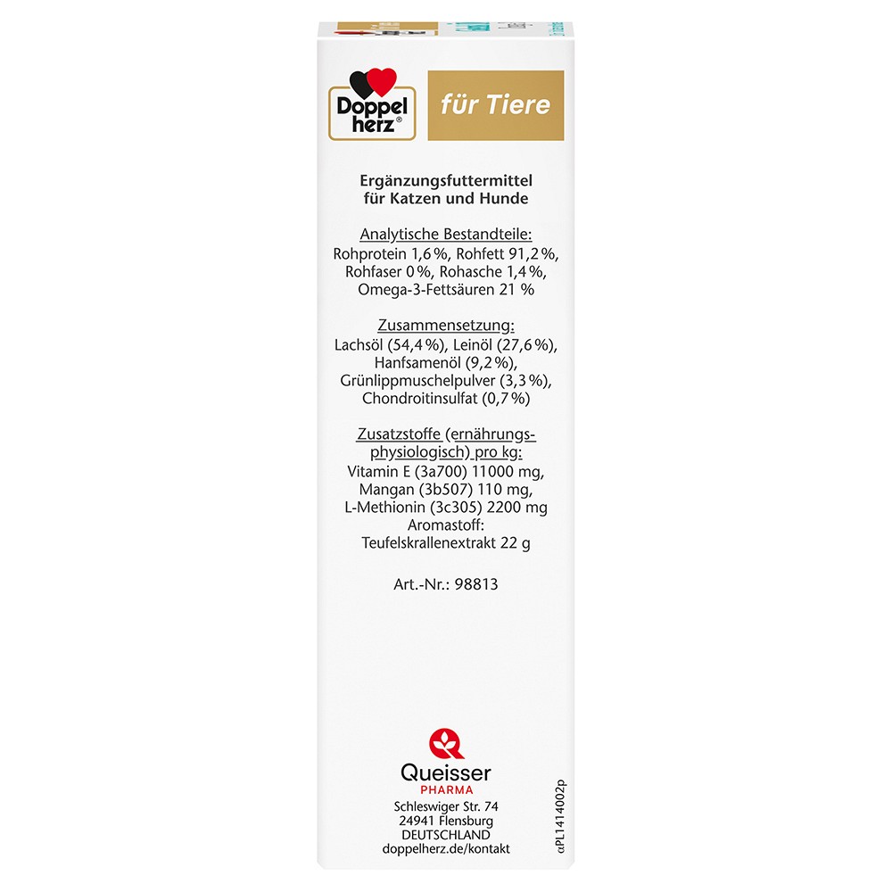 Doppelherz für Tiere Gelenk Öl ist ein Ergänzungsfuttermittel für Katzen und Hunde. Die hochwertige Ölmischung enthält wertvolle Feststoffe, ohne Zusatz von Zucker, Farb- und Konservierungsstoffen.