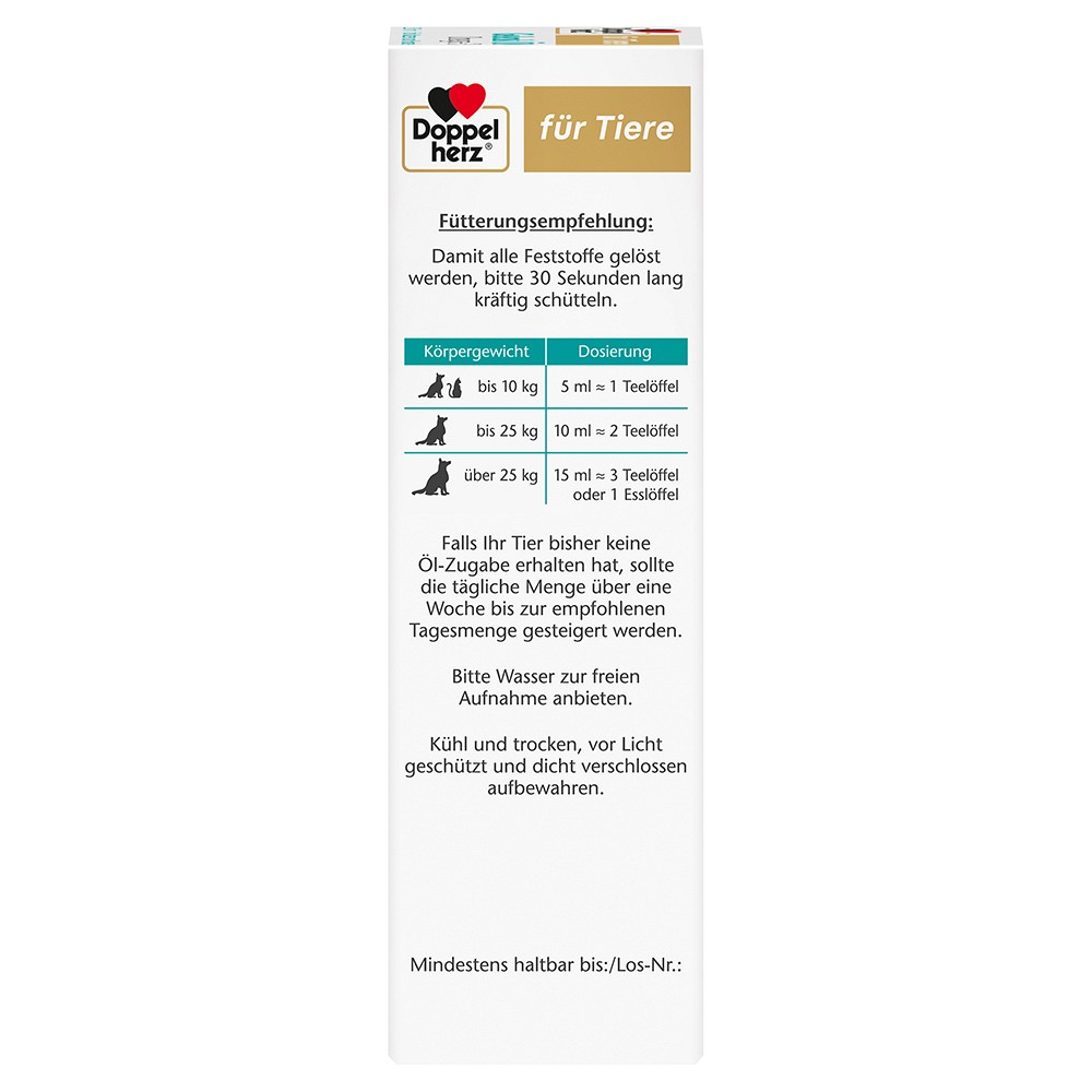 Je nach Gewicht des Tieres werden 1 bis 3 Teelöffel täglich gegeben. Das schmackhafte Öl eignet sich perfekt zum Untermischen im Futter.