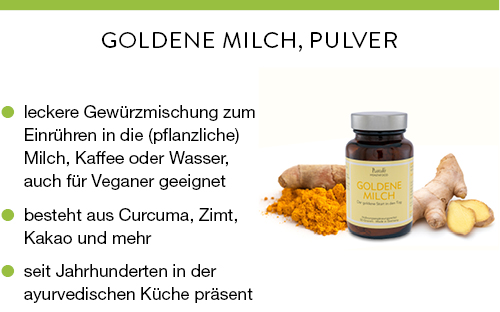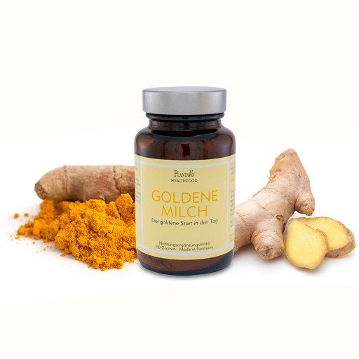 Goldene Milch ist die Bezeichnung für ein Getränk, das in der ayurvedischen Küche schon seit Jahrhunderten getrunken wird. Hauptinhaltsstoff ist hier das Curcuma, welches auch für die charakteristische und namensgebende goldene Farbe verantwortlich ist. Daneben sind noch weitere Gewürze enthalten. Sie kann sich nach Wunsch unterscheiden, jedoch enthält Goldene Milch von PlantaVis eine besonders exquisite Mischung.
