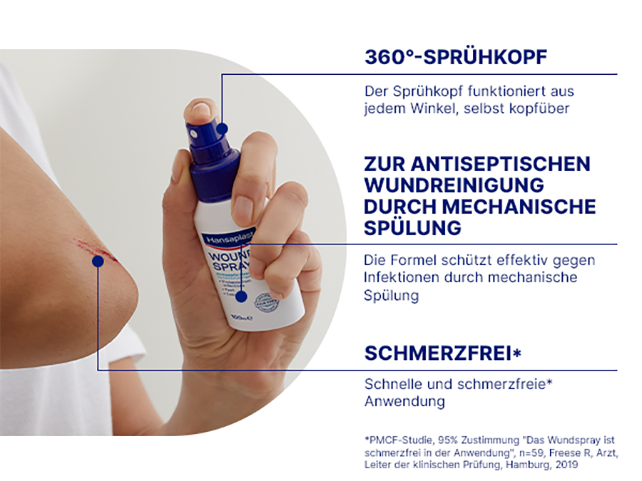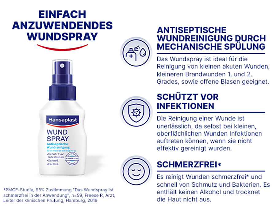 Mit dem Hansaplast Wundspray erhalten akute Wunden, wie zum Beispiel Schürfwunden und Schnittwunden, kleinere Brandwunden 1. und 2. Grades sowie offene Blasen, eine optimale Wundbehandlung. Zur antiseptischen Wundreinigung durch mechanische Spülung. Die Reinigung mit dem Wundspray ist dabei schmerzfrei*.