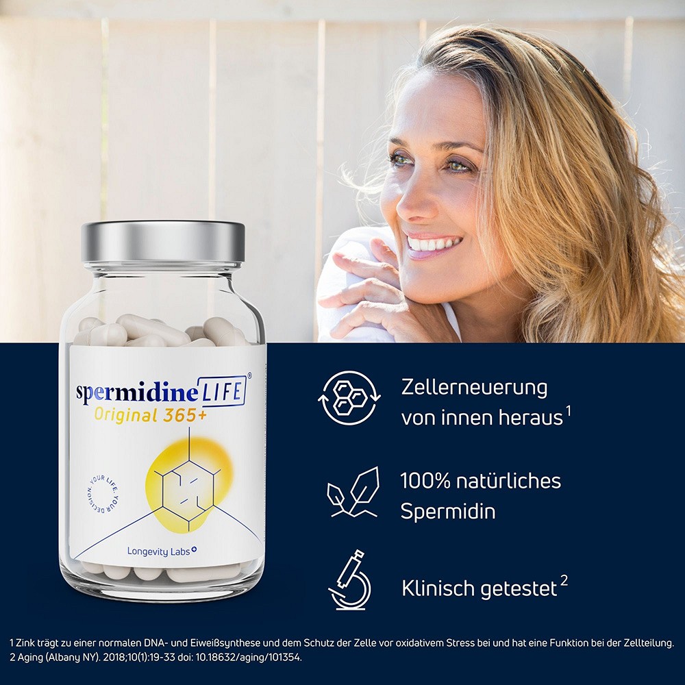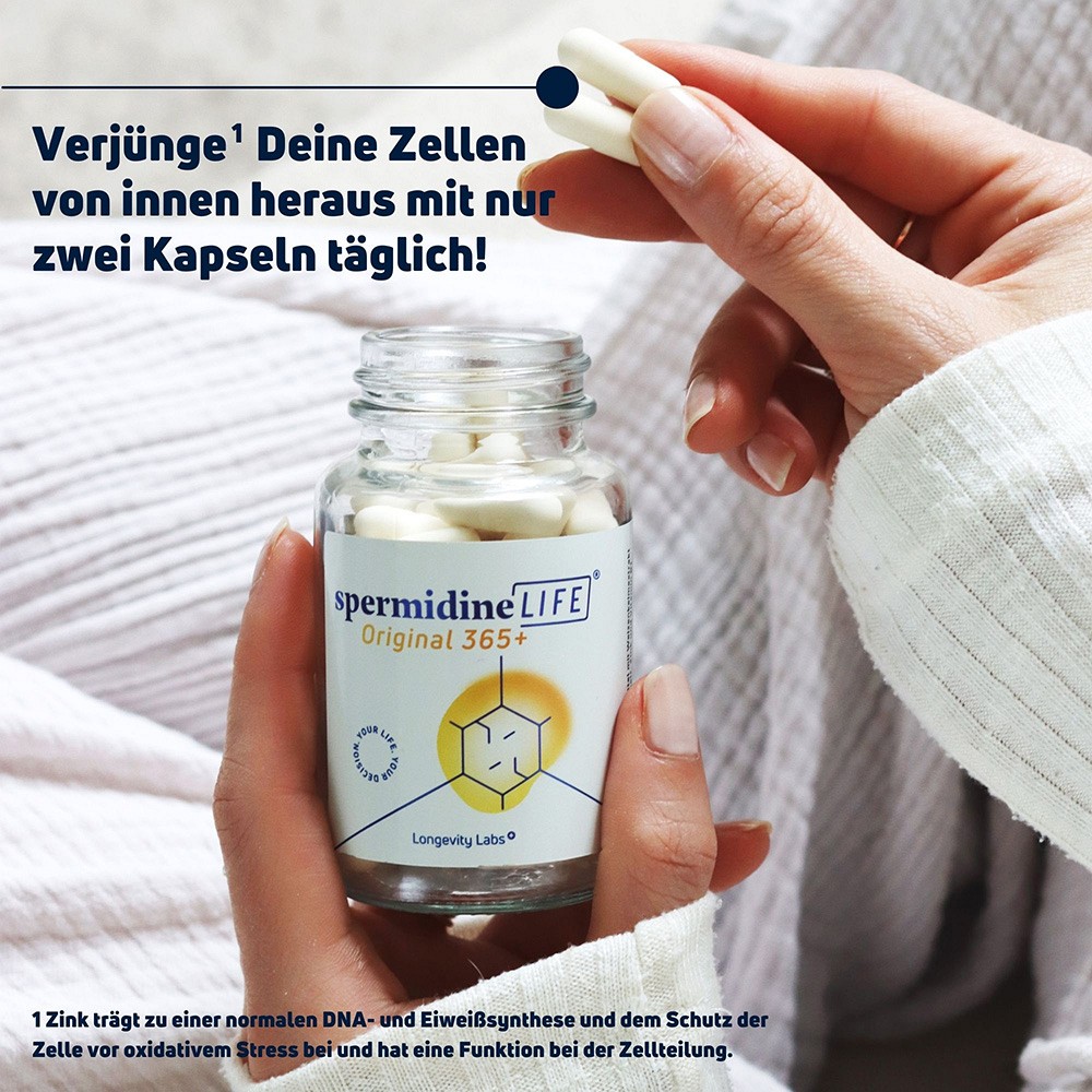 Spermidin ist ein natürliches Polyamin, dass in all unseren Zellen vorkommt und vom Körper grundsätzlich selbst produziert wird. Ab einem Alter von 30-35 Jahren nimmt jedoch dieser Spiegel im Körper ab und schwächt somit die Selbstreinigung der Zellen.¹Dieser ist aber besonders wichtig um den Körper langfristig gesund und fit zu halten. Mithilfe der Inhaltsstoffe Thiamin und Zink, die zusätzlich die Zelle vor oxidativem Stress schützen, wird mit spermidineLIFE® Original 365+ die Zellerneuerung optimal und langfristig unterstützt.¹,²