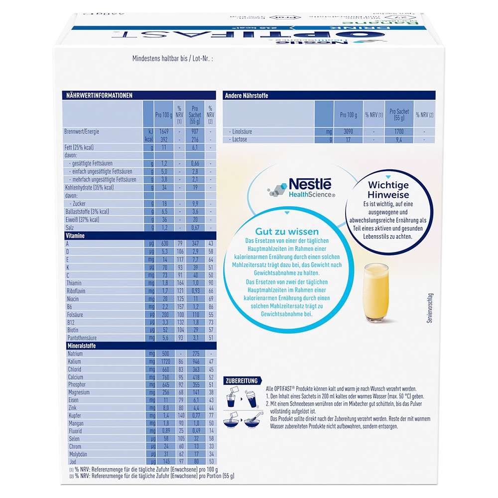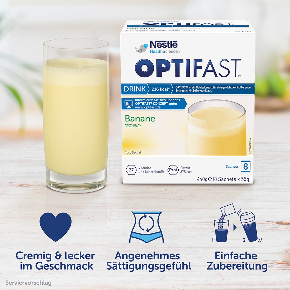 Mahlzeitersatz für eine gewichtskontrollierende Ernährung: Ersetze täglich eine oder zwei Hauptmahlzeit/en durch je ein Sachet OPTIFAST® Drink (1 Sachet = 1 Hauptmahlzeit).Die OPTIFAST® Produkte erfüllen nur im Rahmen einer kalorienarmen Ernährung den angestrebten Zweck, andere Lebensmittel müssen Teil dieser Ernährung sein.