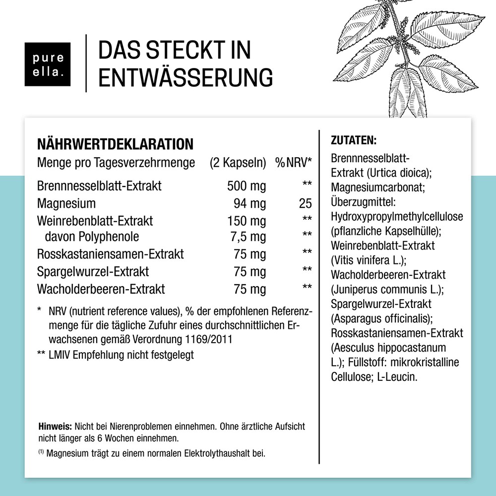 Neben den sich ergänzenden Pflanzenextrakten aus Brennnessel, Weinrebenblatt, Rosskastanie, Spargelwurzel und Wacholderbeere, enthält ENTWÄSSERUNG auch Magnesium – den wichtigsten Mineralstoff für deinen Elektrolythaushalt.