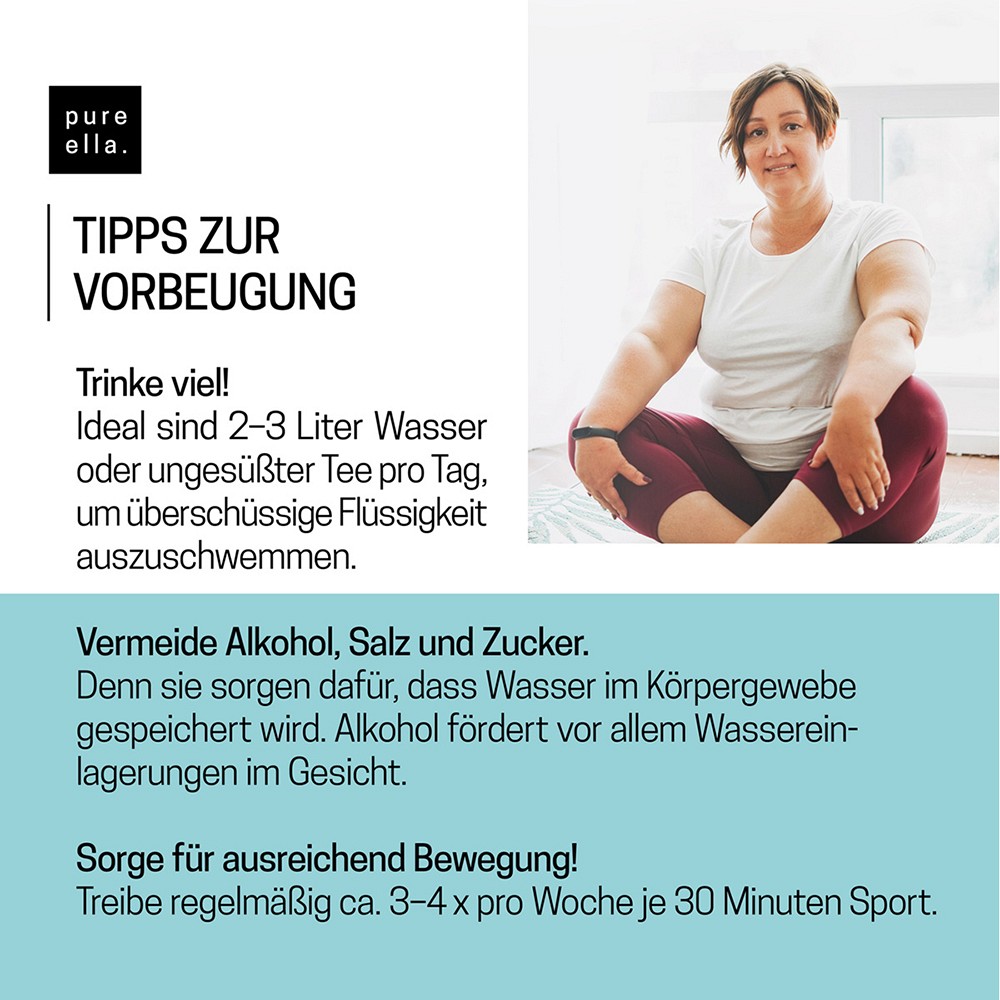 Unsere Empfehlung: Trink über den Tag verteilt ausreichend Flüssigkeit (2–4 Liter), damit der Körper das Wasser auch im Gewebe freigeben kann!