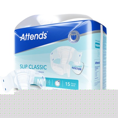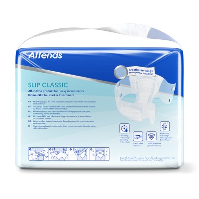 Attends Slip Classic sind saugfähige Einmal-Slips mit atmungsaktiven Seitenflügeln. Sie sitzen sicher und bieten so das Extra an Schutz bei sehr starker Harn- und/oder Stuhlinkontinenz.