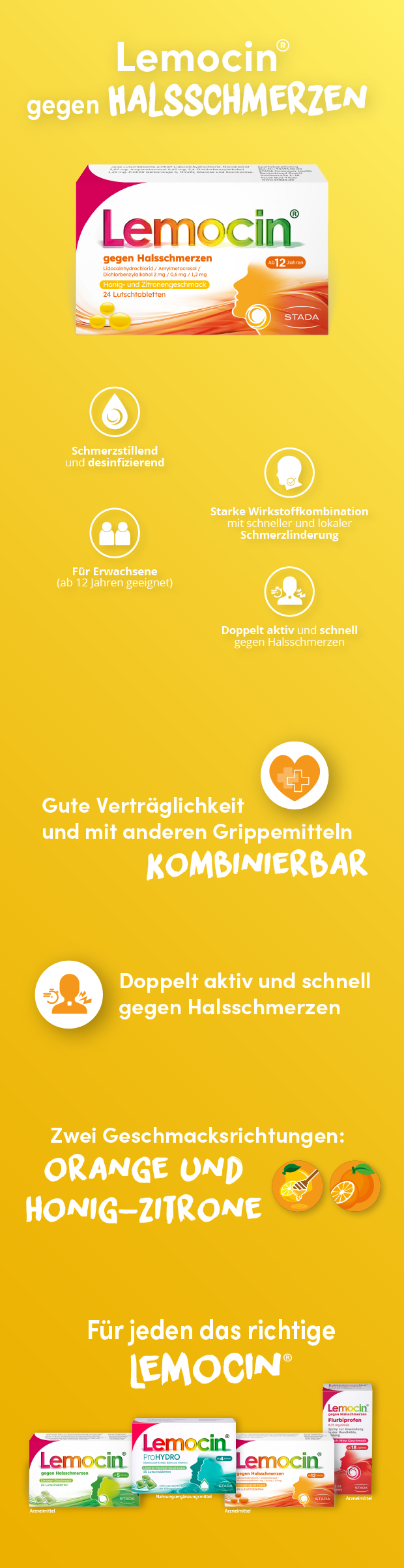Es gibt Situationen, in denen eine schnelle Reaktion gefragt ist. Das gilt auch bei Halsschmerzen. Deshalb gibt es das schnelle, doppelt aktive Lemocin gegen Halsschmerzen für Erwachsene mit Orangengeschmack oder Honig-Zitronengeschmack. Ob Halskratzen, Schluckbeschwerden, Rötungen und Schwellungen im Rachen: Die praktischen Lemocin Lutschtabletten mit der einzigartigen Wirkstoffkombination wirken gegen diverse Halsschmerz-Symptome, lindern schnell den Schmerz und wirken zudem antiseptisch.SCHNELL & DOPPELT AKTIV: LEMOCIN GEGEN HALSSCHMERZEN