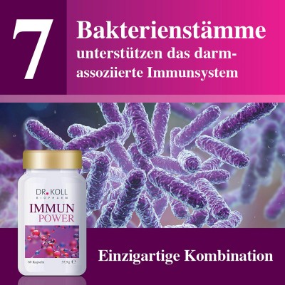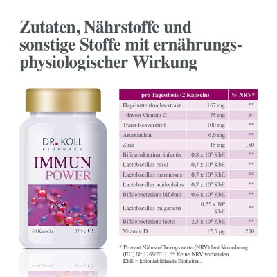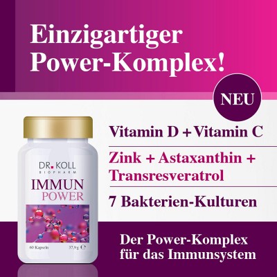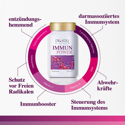 Die Wissenschaftler von Dr. Koll Biopharm haben mit IMMUN-POWER einen neuen, einzigartigen und hochdosierten Power-Komplex für das Immunsystem entwickelt der alle wichtigen Komponenten enthält, die als besonders effektiv gelten.