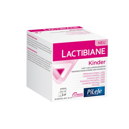 Das Mikrobiotikum Lactibiane® Kinder ist für Kinder ab 6 Monaten geeignet und unterstützt das Immunsystem. Es enhält nicht nur die fünf mikrobiotischen Stämme Bifidobacterium longum LA 101, Lactobacillus helveticus LA 102, Lactococcus lactis LA 103, Streptococcus thermophilus LA 104 und Lactobacillus rhamnosus LA 801, sondern deckt auch 75 % des Tagesbedarfs an Vitamin D, das eine große Rolle in der Immunabwehr spielt.