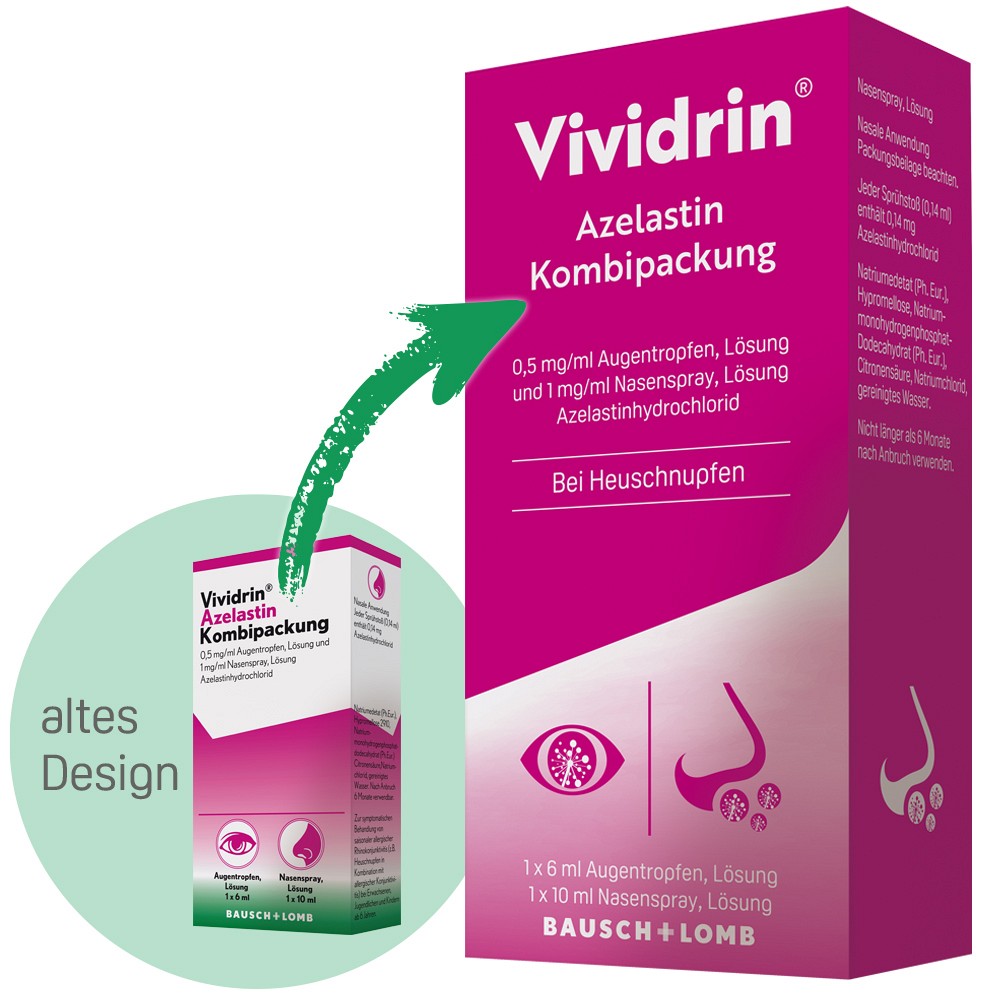 Anwendungsgebiete: Vividrin Azelastin Kombipackung enthält den Wirkstoff Azelastin, der zu einer Gruppe von Arzneimitteln gehört, die als Antihistaminika bezeichnet werden. Antihistaminika verhindern die Wirkungen von Substanzen (wie z. B. Histaminen), die vom Körper im Zusammenhang mit einer allergischen Reaktion produziert werden. Azelastin reduziert Entzündungen am Auge und in der Nase. Es wird angewendet zur symptomatischen Behandlung von saisonaler allergischer Rhinokonjunktivitis (z. B. Heuschnupfen in Kombination mit allergischer Bindehautentzündung) bei Erwachsenen, Jugendlichen und Kindern ab 6 Jahren. Wenn Sie sich nach 2 Tagen nicht besser oder gar schlechter fühlen, wenden Sie sich an Ihren Arzt.