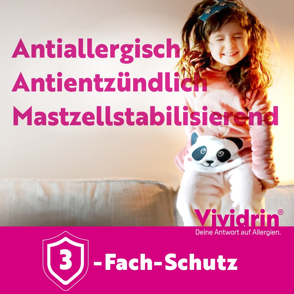 Bei Kontakt mit Allergenen setzt der Körper vermehrt Histamin frei, was eine Immunreaktion auslöst. Der gut verträgliche Wirkstoff Azelastin bietet dreifachen Schutz gegen allergische Symptome.** Durch Hemmung der Histamin-Rezeptoren reduziert er typische Symptome wie Niesreiz, kribbelnde Nase oder Juckreiz und Rötungen der Augen. Gleichzeitig stabilisiert Azelastin die Abwehrzellen, mindert die Freisetzung von Histamin und wirkt entzündungshemmend.* Fachinformation Vividrin® Azelastin Kombi (Stand 12.2023)