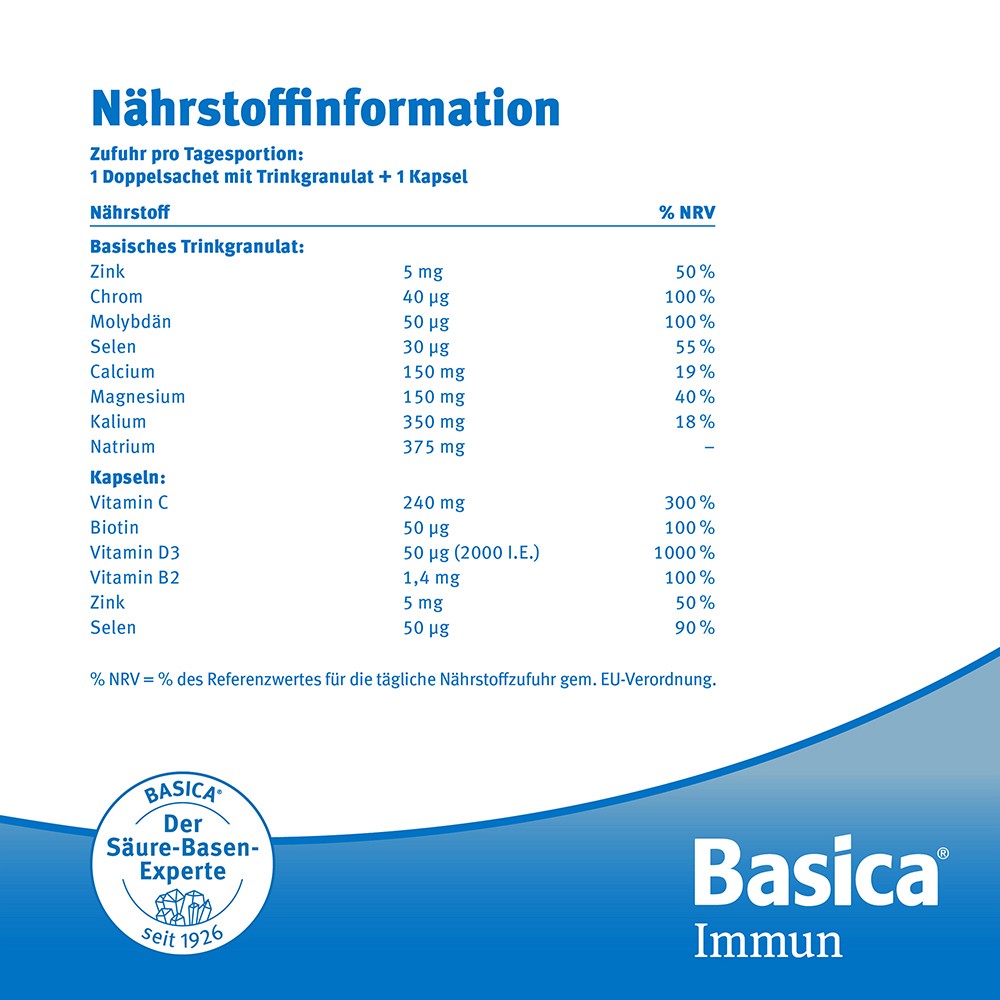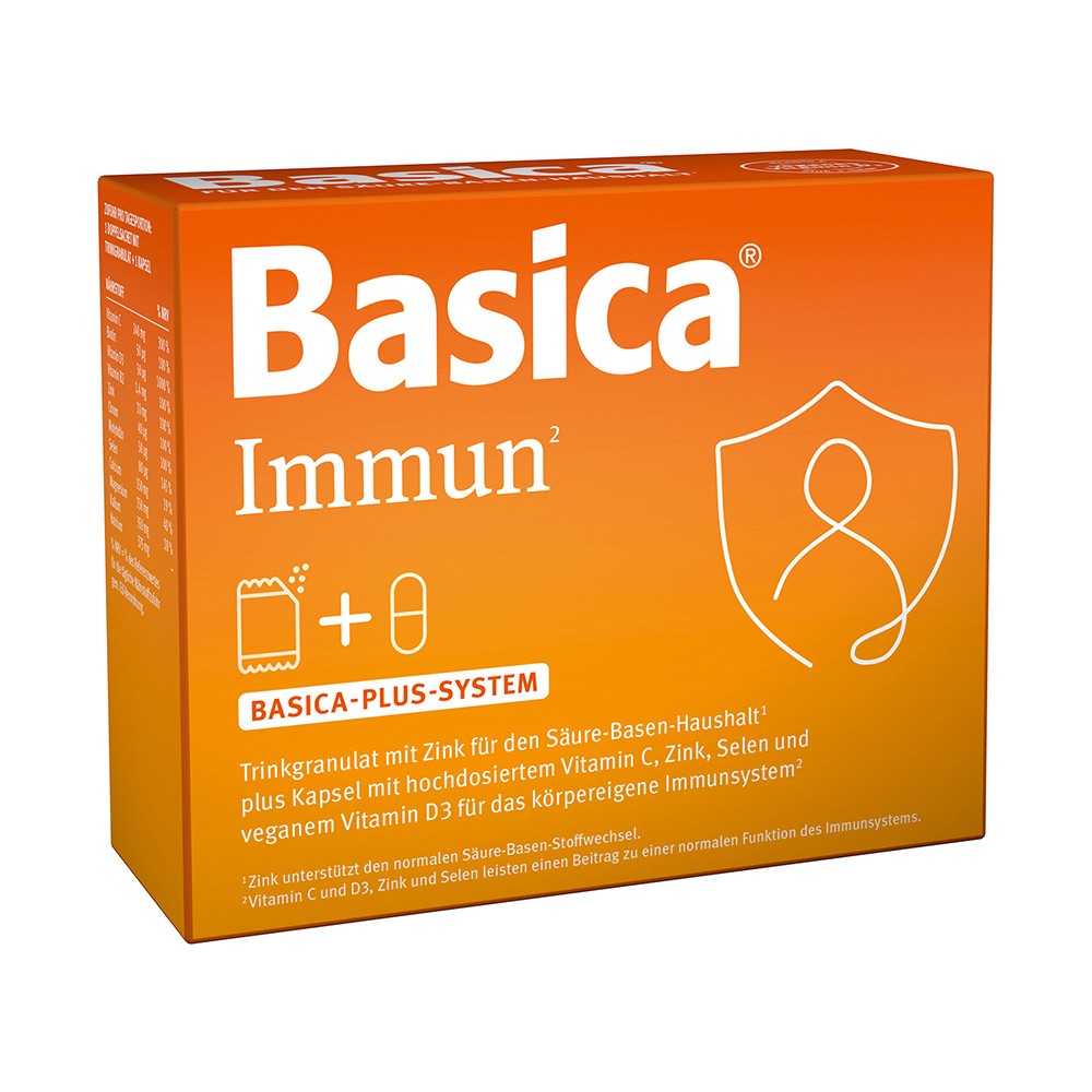 Nahrungsergänzungsmittel mit basischen Mineralstoffen, Spurenelementen und Vitaminen.Trinkgranulat und Kapsel unterstützen das körpereigene Immunsystem¹ mit hochdosiertem Vitamin C, Zink, Selen und veganem Vitamin D3. Das basische Trinkgranulat unterstützt mit Zink den normalen Säure-Basen-Stoffwechsel. Zusätzlich unterstützen weitere Mikronährstoffe dabei, die körpereigenen Schutzsysteme aufrechtzuerhalten².