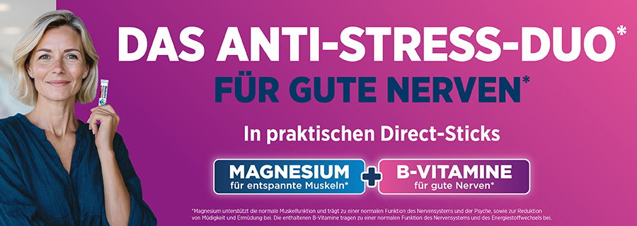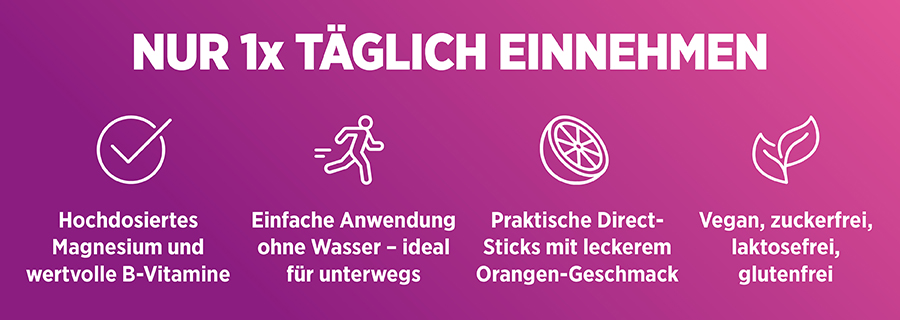 Die besondere Magnesium-Komposition vereint schnellfreisetzendes mit hochdosiertem Depot-Magnesium und wichtigen B-Vitaminen (B1, B2, B6 und B12), die eine normale Funktion des Nervensystems unterstützen. Zusätzlich trägt Magnesium zur Entspannung der Muskulatur bei.