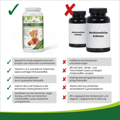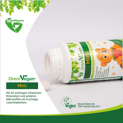 OmniVegan® Mini ist von der britischen Vegan Society zertifiziert. Das Produkt ist ohne Gentechnik und ohne tierische Inhaltsstoffe. Vitamine, Mineralstoffe und Spurenelemente in einer speziell für Kinder dosierten und ausgewogenen Mischung.