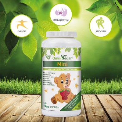 OmniVegan® Mini enthält außerdem Calzium, Vitamin D, Jod und Eisen, die alle für eine gesunde Entwicklung von Kindern wichtig sind. Calcium und Vitamin D sind für die normale Knochenentwicklung bei Kindern notwendig, Jod trägt zum normalen Wachstum und Eisen trägt zur normalen kognitiven Entwicklung bei Kindern bei.