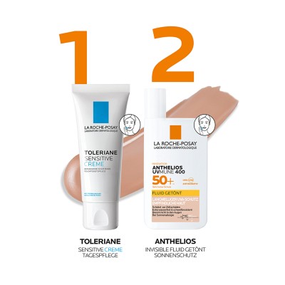 Anthelios Invisible Fluid Getönt UVMune 400 LSF 50+ bei empfindlicher und zu Sonnenallergie neigender Haut. Die getönte Sonnencreme von La Roche Posay bietet einen täglichen Sonnenschutz für das Gesicht und kaschiert Unebenheiten und Rötungen.