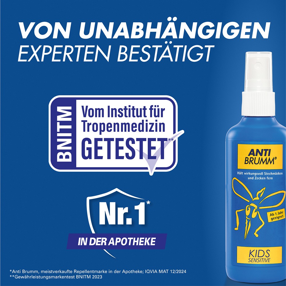 Anti Brumm Kids Sensitive enthält den etablierten Wirkstoff Icaridin (10%). Icaridin zählt zusammen mit DEET zu den wirksamsten Insektenrepellents und hält sowohl heimische und tropische Mücken als auch Zecken zuverlässig fern. Icaridin macht das Repellent zu einem Mückenspray, das sich auch bei empfindlicher Haut etabliert hat.Anti Brumm Kids Sensitive ist bereits für Kinder ab 1 Jahr geeignet. Für zusätzlichen Schutz können auch Kleidungsstücke besprüht werden. Anti Brumm Kids Sensitive wurde dermatologisch getestet und vom Bernhard-Nocht-Institut für Tropenmedizin (BNITM) bestätigt*.