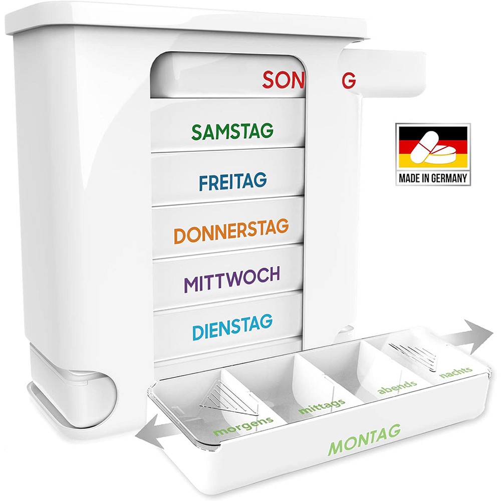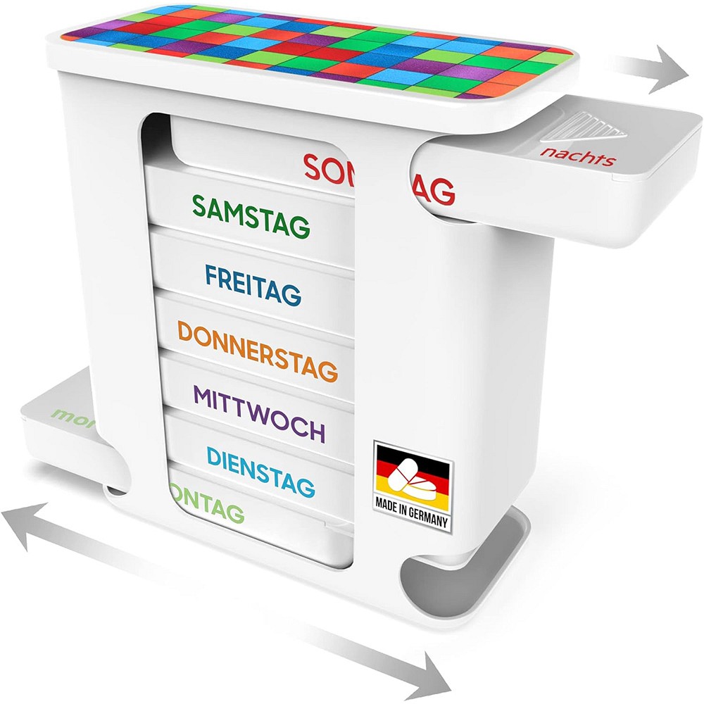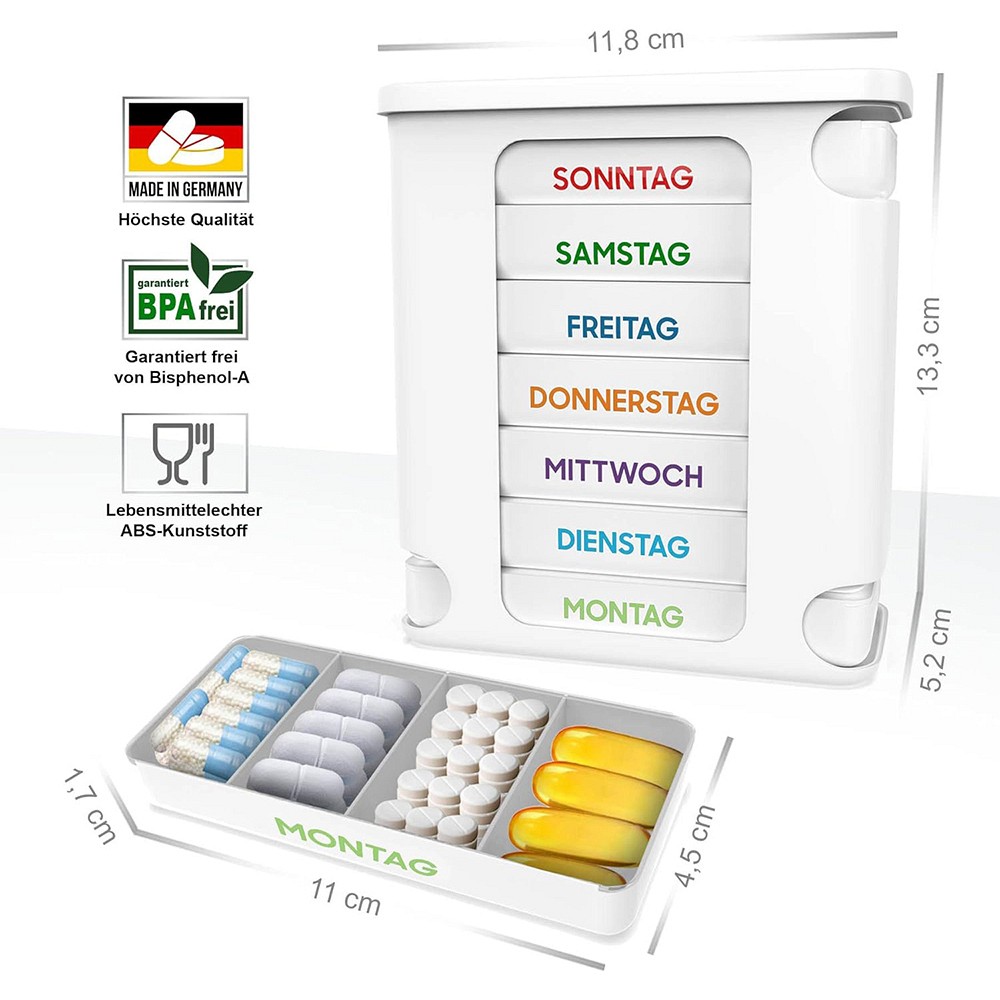 - Übersichtliche und große Fächer mit abgerundeten Innenkanten, damit auch kleinere Tabletten besser zu entnehmen sind.