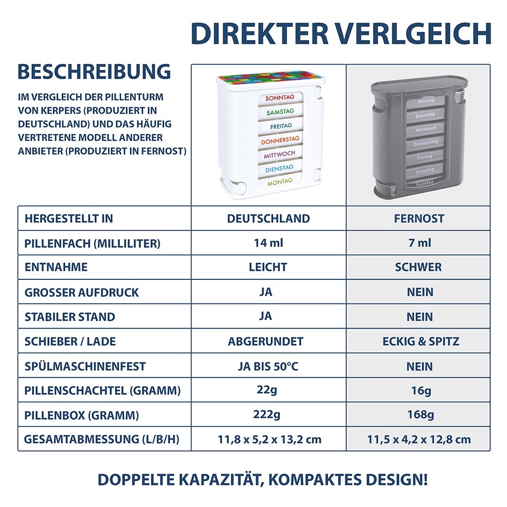 Der Kerpers Pillenturm zeichnet sich durch eine einfache Handhabung und hohe Qualität aus!- Der Kerpers Pillenturm wird exklusiv in Deutschland aus hochwertigem ABS-Kunststoff hergestellt. Wir sorgen für effiziente und klimaschonende Transportwege. Lebensmittelecht und geeignet für Spülmaschinen bis 50 °C