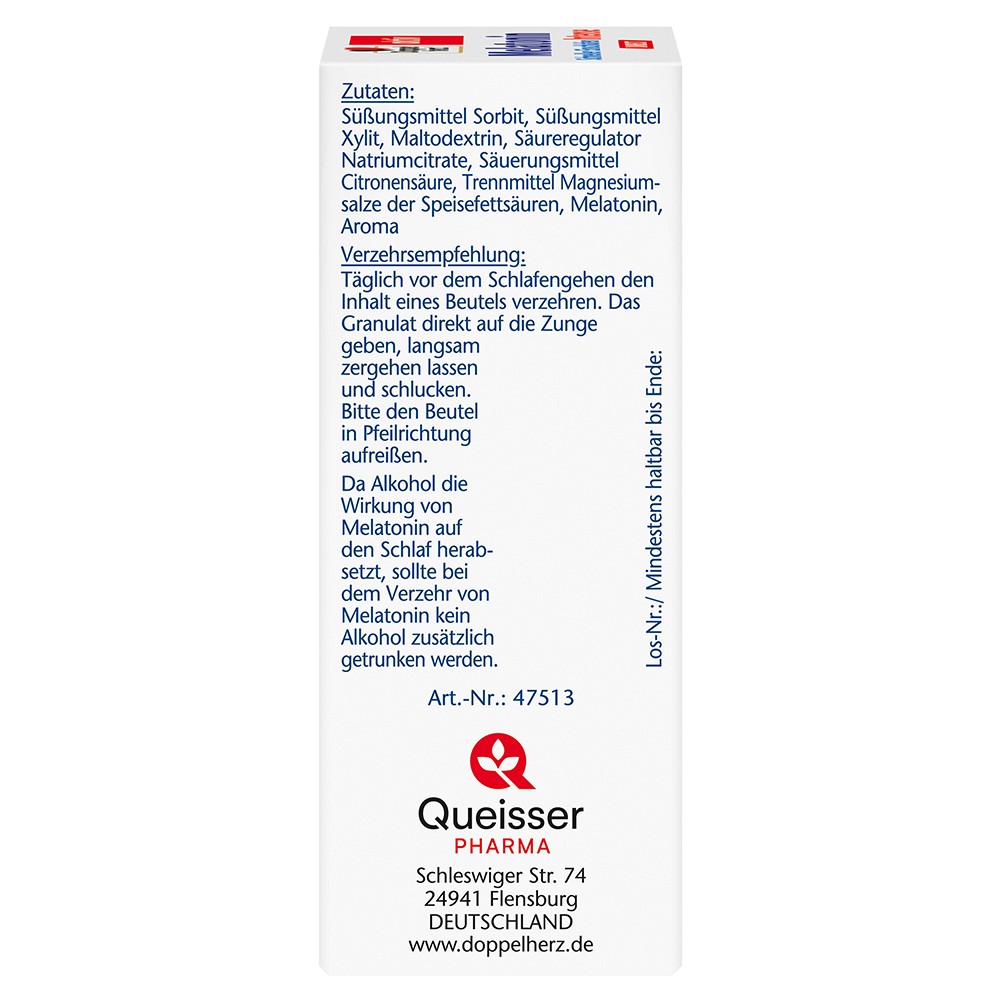 Täglich vor dem Schlafengehen den Inhalt eines Beutels verzehren. Das Granulat direkt auf die Zunge geben, langsam zergehen lassen und schlucken. Bitte den Beutel in Pfeilrichtung aufreißen.Da Alkohol die Wirkung von Melatonin auf den Schlaf herabsetzt, sollte bei dem Verzehr von Melatonin kein Alkohol zusätzlich getrunken werden.