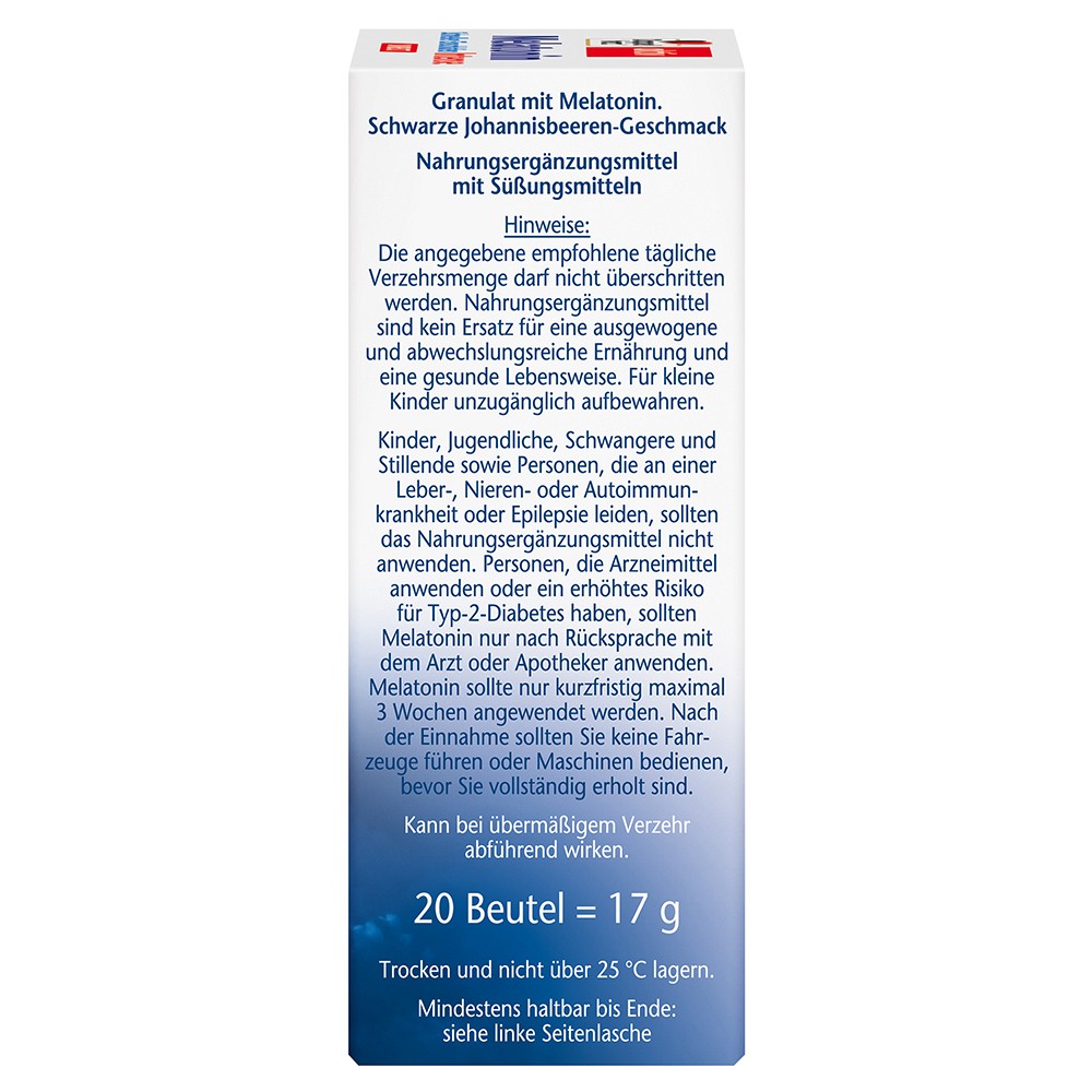 Melatonin sollte nur kurzfristig maximal 3 Wochen angewendet werden. Nach der Einnahme sollten Sie keine Fahrzeuge führen oder Maschinen bedienen, bevor Sie vollständig erholt sind.