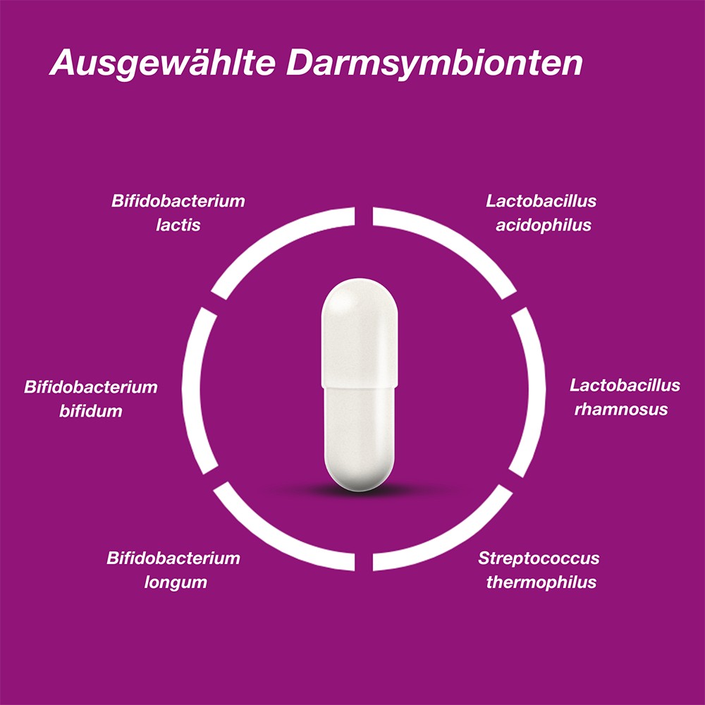 • Enthaltene Darmsymbionten: Bifidobacterium lactis, Bifidobacterium longum, Bifidobacterium bifidum, Lactobacillus acidophilus, Lactobacillus rhamnosus, Streptococcus thermophilus.