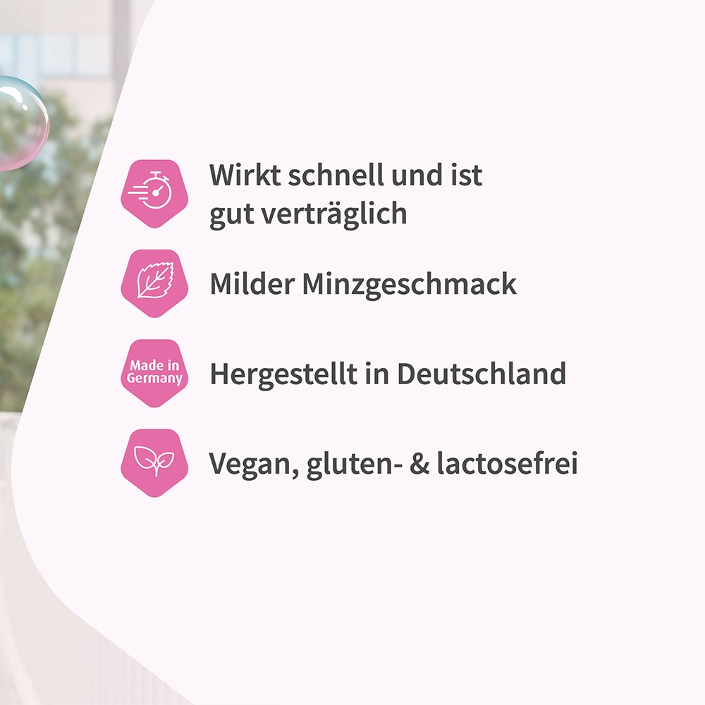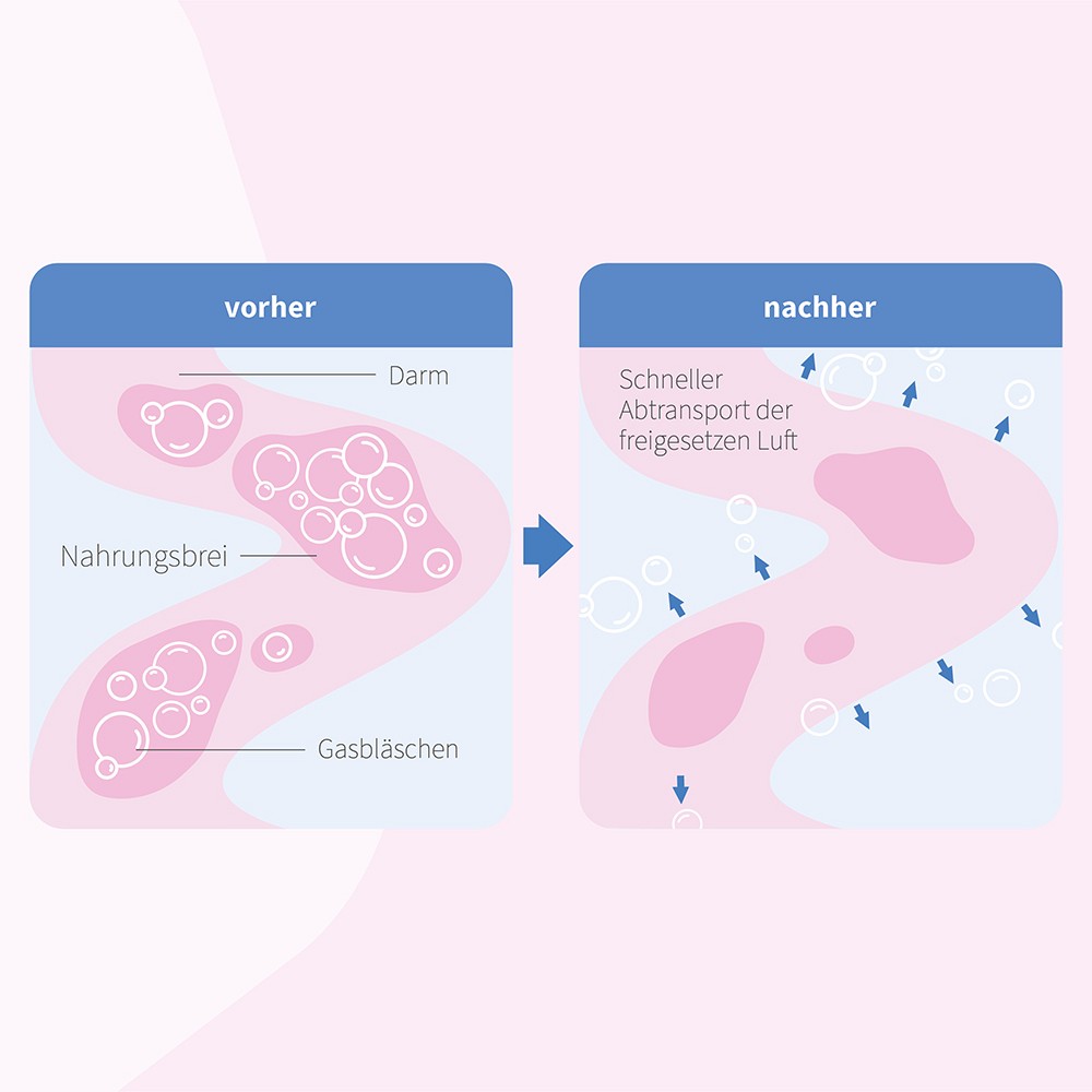- Wirkstoff Simeticon löst Luftblasen und Schäume innerhalb kurzer Zeit auf und wird dabei nicht vom Körper aufgenommen