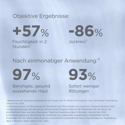 ² Anwendungstest zur Bewertung der Sicherheit und Wirksamkeit von Hyaluronic Moisture Sensitive Skin mittels dermatologischer Bewertung anhand eines Stinging-Tests bei 30 Probanden (25–45 Jahre) mit empfindlicher Haut und allen Hauttypen. Tägliche Anwendung über 4 Wochen. Data on file, 2022.