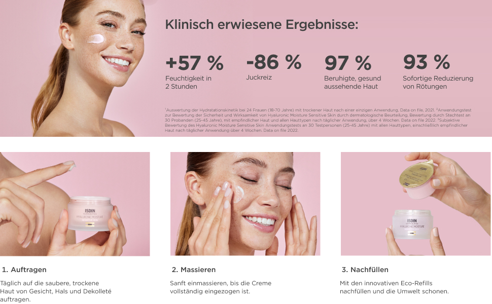 Hyaluronic Moisture Sensitive Skin morgens und abends auf die saubere und trockene Haut von Gesicht, Hals und Dekolleté auftragen. Einmassieren, bis die Creme vollständig eingezogen ist.